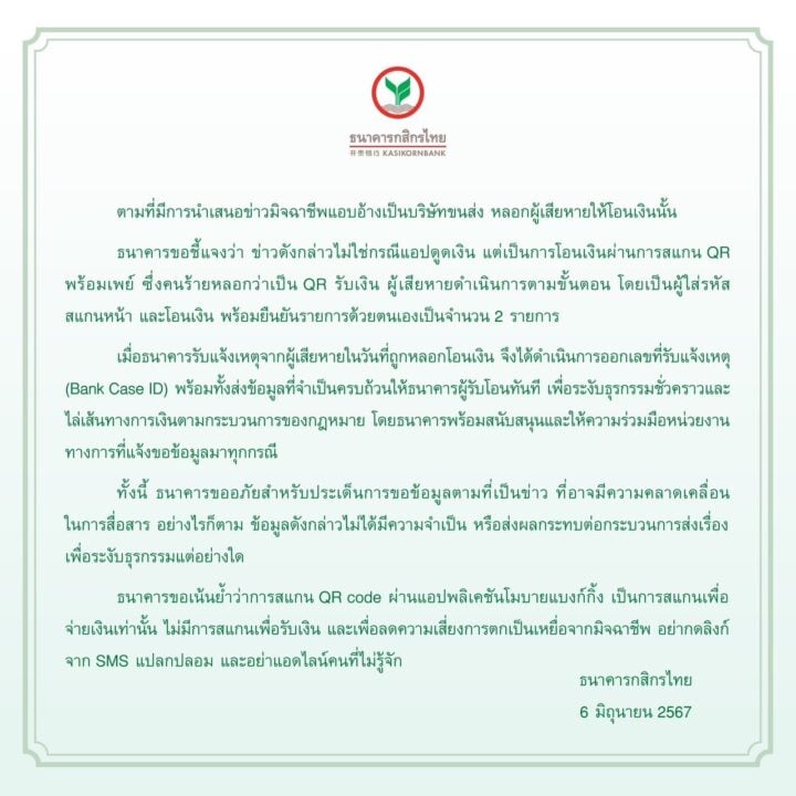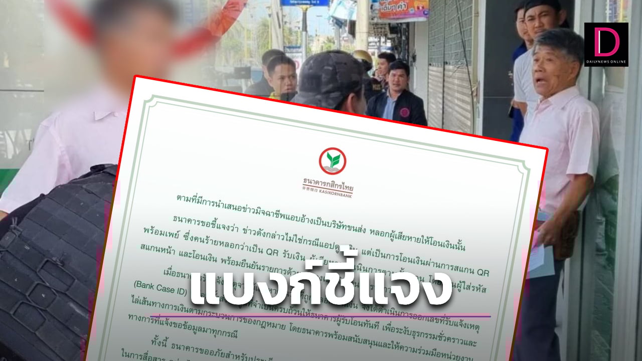 ล่าสุด ธนาคารกสิกรไทย ชี้แจงตามที่มีการนำเสนอข่าวมิจฉาชีพแอบอ้างเป็นบริษัทขนส่ง หลอกผู้เสียหายให้โอนเงินนั้น