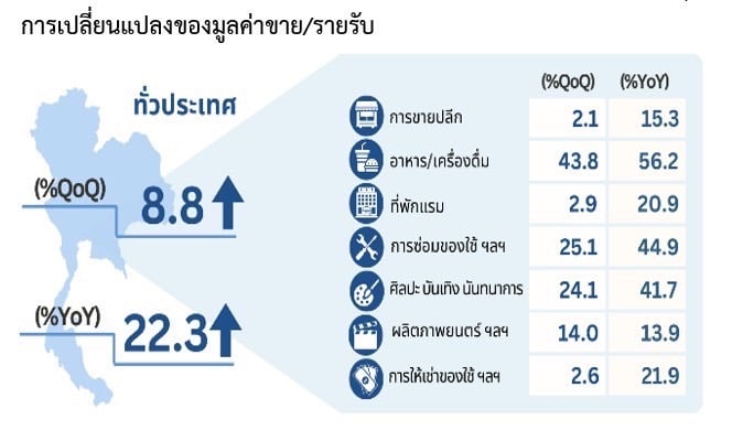น.ส.กฤษณา กล่าวต่อว่า เมื่อพิจารณามูลค่ารายรับของไตรมาส 1 ปี 67 เมื่อเทียบกับไตรมาส 1 ปี 66 พบว่า มีมูลค่ารายรับเพิ่มขึ้น 22.3% โดยธุรกิจการบริการอาหารและเครื่องดื่ม มีรายรับเพิ่มขึ้นมากที่สุด 56.2% รองลงมาคือ ธุรกิจการซ่อมของใช้ส่วนบุคคลและของใช้ในครัวเรือน และกิจกรรมการบริการส่วนบุคคลอื่น ๆ มีรายรับเพิ่มขึ้น 44.9% และธุรกิจเกี่ยวกับกิจกรรมศิลปะ ความบันเทิง และนันทนาการ มีรายรับเพิ่มขึ้น 41.7%
