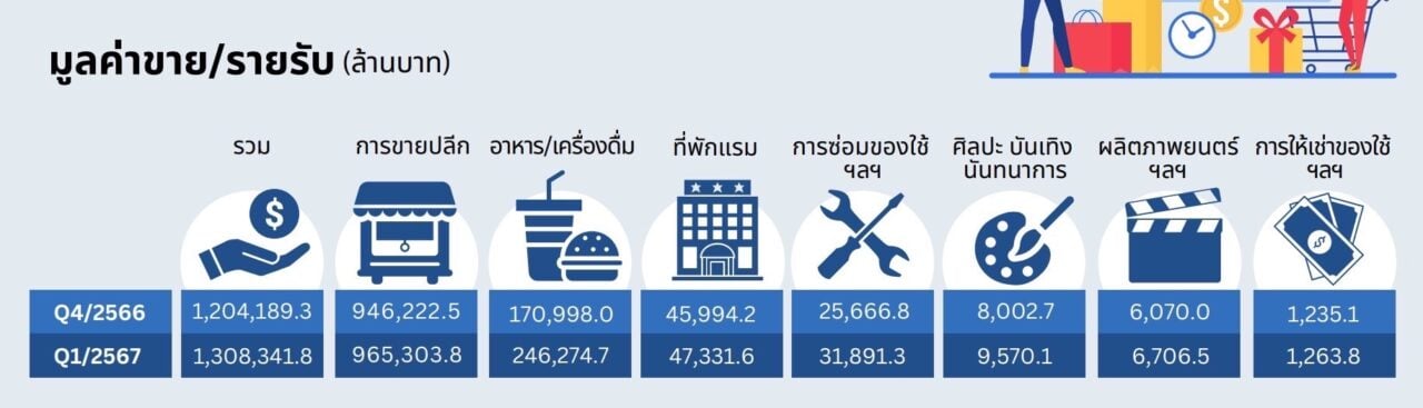 โดยผลการสำรวจยอดขายรายไตรมาสนั้น พบว่าไตรมาส 1 ปี 67 ธุรกิจการขายปลีกสินค้า และการบริการทั่วประเทศ มีมูลค่ารายรับเพิ่มขึ้นจากไตรมาส 4 ปี 66 จำนวน 8.8% โดยธุรกิจการบริการอาหาร และเครื่องดื่ม มีรายรับเพิ่มขึ้นมากที่สุด 43.8% รองลงมาคือ ธุรกิจการซ่อมของใช้ส่วนบุคคลและของใช้ในครัวเรือน และกิจกรรมการบริการส่วนบุคคลอื่น ๆ มีรายรับเพิ่มขึ้น 25.1% และธุรกิจเกี่ยวกับกิจกรรมศิลปะ ความบันเทิง และนันทนาการ มีรายรับเพิ่มขึ้น 24.1% ตามลำดับ