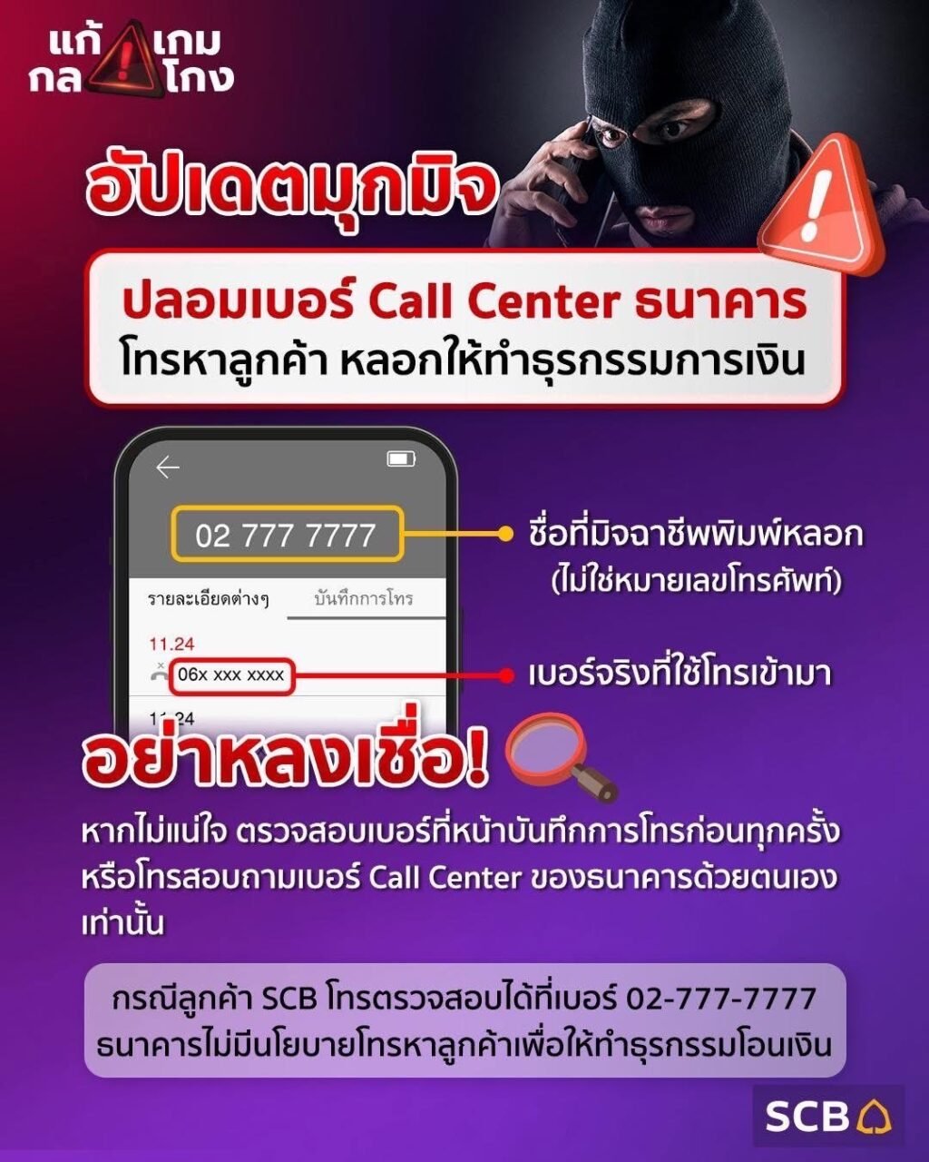 รู้ทันกลโกงมิจฉาชีพ อย่าหลงเชื่อเด็ดขาด โดยมิจฉาชีพปลอมเบอร์ Call Center ธนาคาร โทรหาลูกค้า หลอกให้ทำธุรกรรมการเงิน สังเกตจาก ชื่อที่มิจฉาชีพพิมพ์หลอก (ไม่ใช่หมายเลขโทรศัพท์) ของจริงต้องเป็นหมายเลขโทรศัพท์ 02 777 7777 หรือมิจฉาชีพใช้เบอร์จริง เช่น 06x xxx xxxx โทรเข้ามา