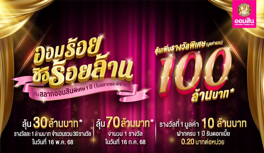 เปิดเงื่อนไข สลากออมสินพิเศษ 1 ปี “ออมร้อย ชิงร้อยล้าน” เริ่มฝากแค่ 100 มีสิทธิ์ลุ้น 100 ล้าน เปิดฝากสลากแล้ววันนี้