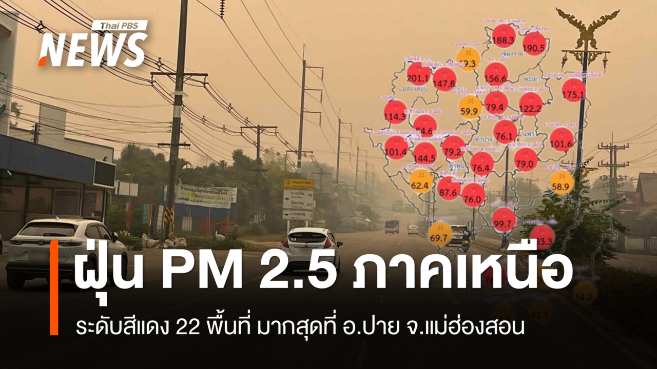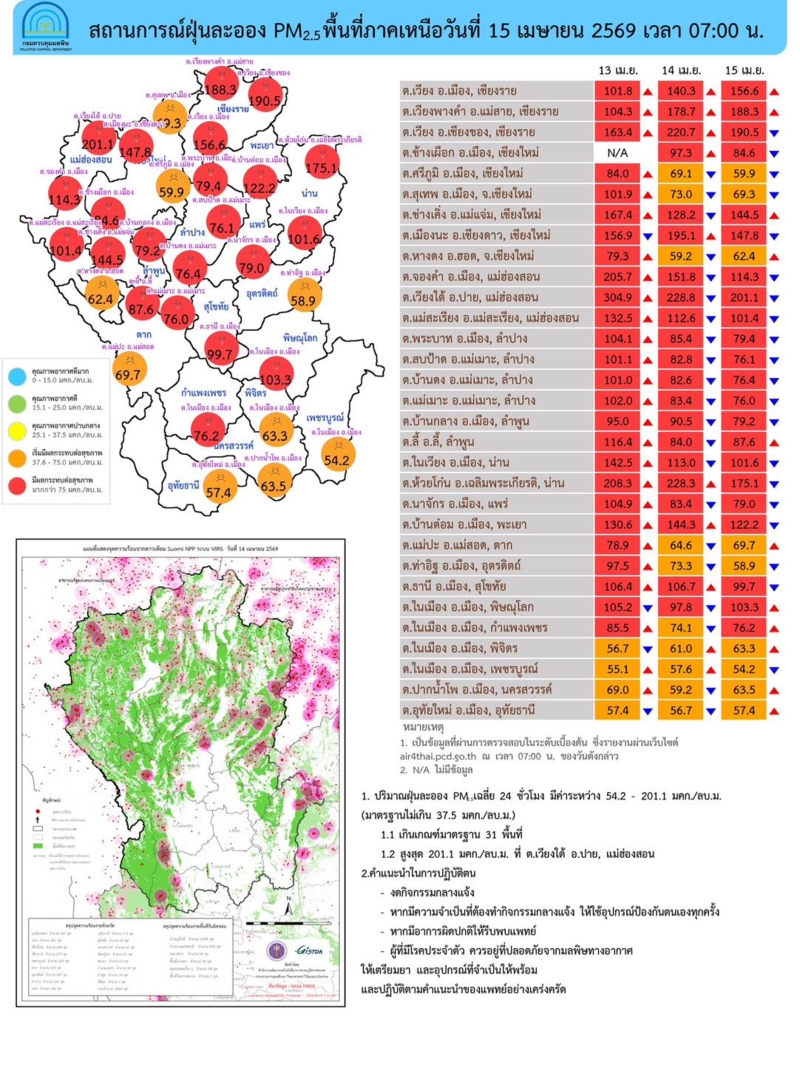 ภาคเหนือ-อีสาน ฝุ่น PM 2.5 ยังสูงเกินค่ามาตรฐาน โดยภาคเหนืออยู่ในระดับสีแดง มีผลกระทบต่อสุขภาพ 22 พื้นที่ มากสุดที่ ต.เวียงใต้ อ.ปาย จ.แม่ฮ่องสอน วัดได้ 201.1 มคก./ลบ.ม.วันนี้ (15 เม.ย.2569) เวลา 07.00 น. ศูนย์สื่อสารการแก้ไขปัญหามลพิษทางอากาศ รายงานการติดตามตรวจสอบคุณภาพอากาศ สรุปดังนี้