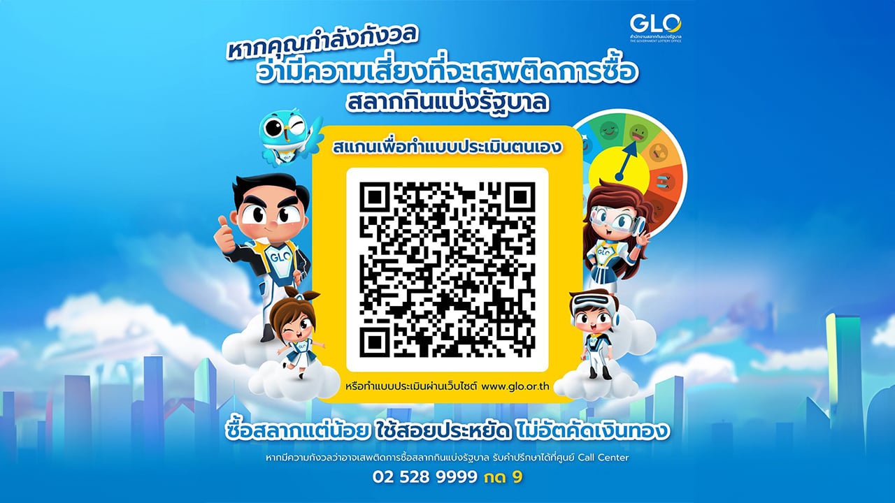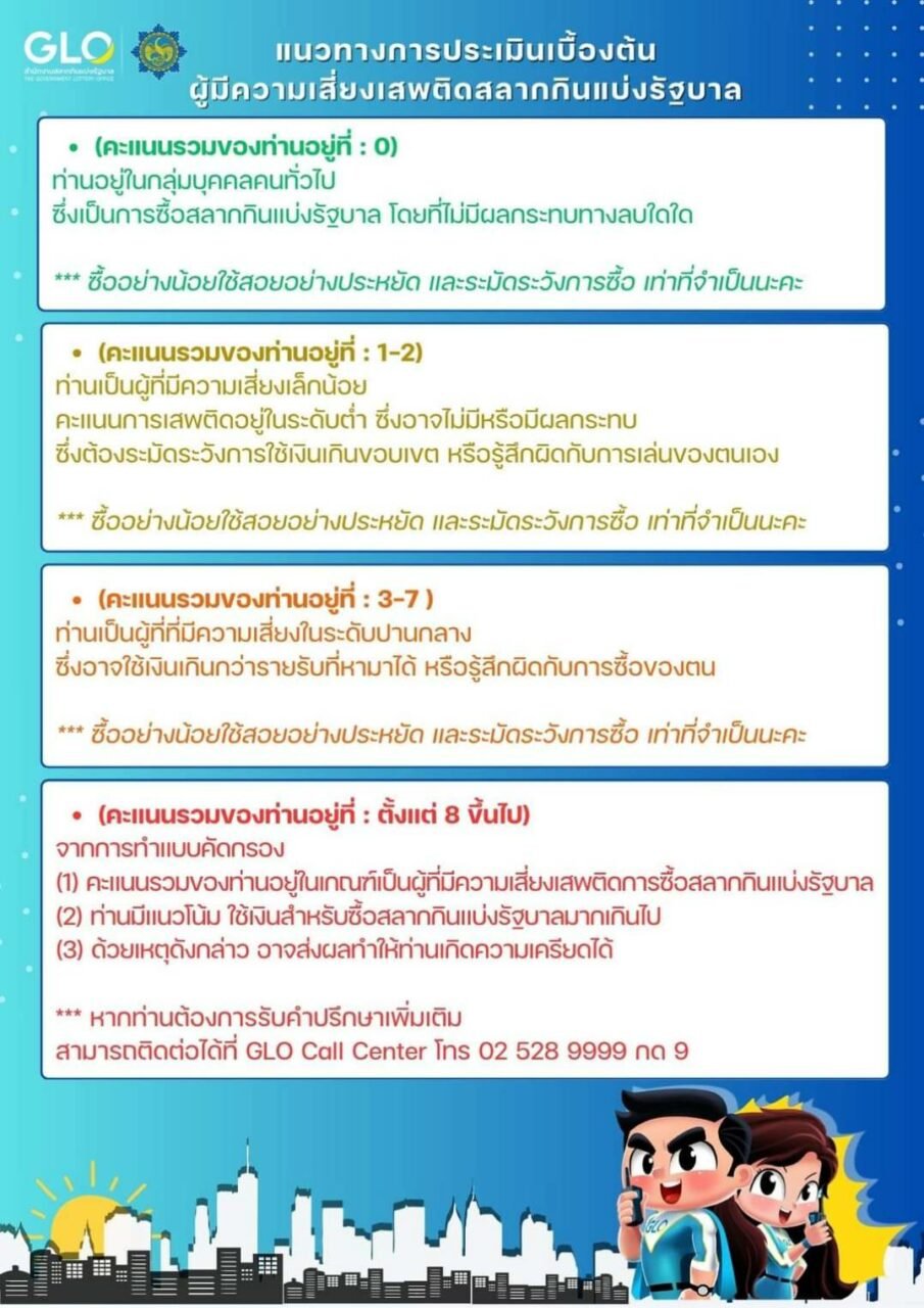 สำนักงานสลากกินแบ่งรัฐบาล หรือ GLO มีความห่วงใยต่อสังคม จัดทำแบบฟอร์มประเมินเพื่อวัดความเสี่ยงในการเสพติดการซื้อสลากกินแบ่งรัฐบาล พร้อมรับคำแนะนำการซื้ออย่างเหมาะสม