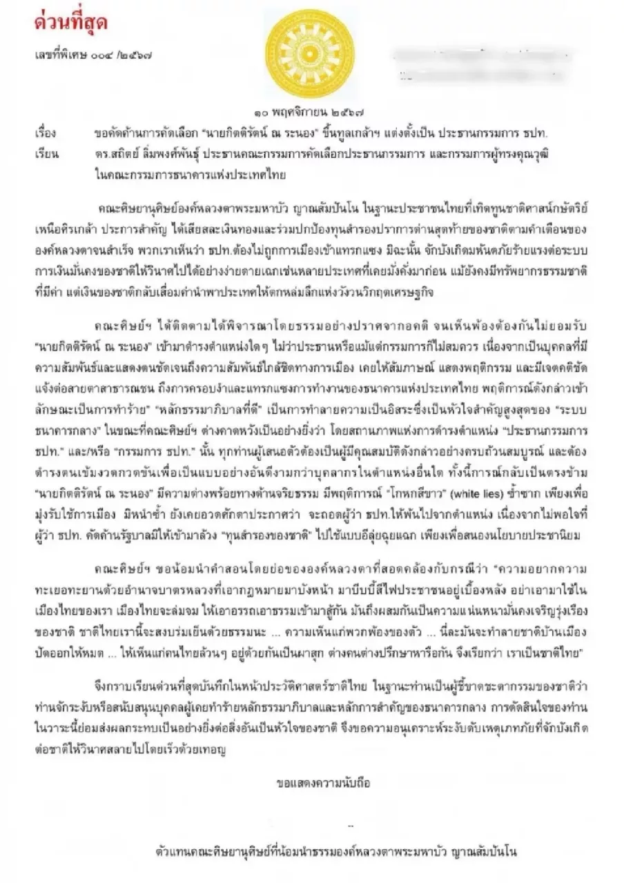 คณะศิษยานุศิษย์องค์หลวงตาพระมหาบัว ญาณสัมปันโน ยื่นคัดค้าน "กิตติรัตน์ ณ ระนอง" นั่งประธานบอร์ดแบงก์ชาติ ย้ำ ธปท. ต้องไม่ถูกการเมืองเข้าแทรกแซง