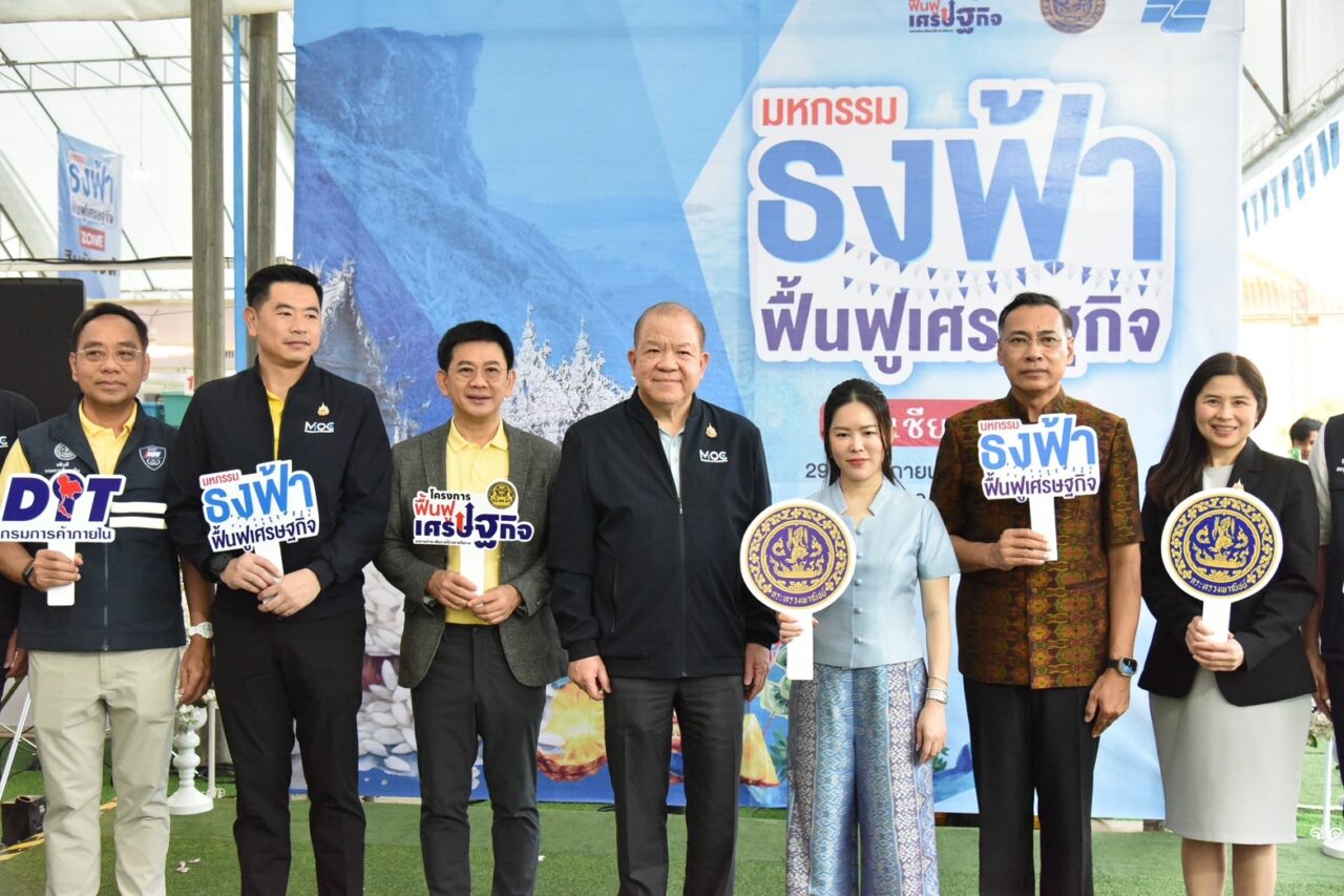 ภายในงาน มีการจำหน่ายสินค้าไฮไลต์ สินค้าประมง และสินค้าผลไม้ที่เชื่อมโยงจากกลุ่มเกษตรกร และกลุ่มวิสาหกิจชุมชน ในราคาพิเศษทุกวัน อาทิ ไข่ไก่เบอร์ M แผงละ 95 บาท น้ำตาลทรายขาว กิโลกรัมละ 24 บาท น้ำมันพืชปาล์มขวดละ 46 บาท ข้าวหอมมะลิ 100% (5 กก.) ถุงละ 150 บาท กุ้งเผา กล่องละ 199 บาท ส้มโอขาวใหญ่ ลูกละ 40 บาท สับปะรดภูแล กิโลกรัมละ 20 บาท และส้มเขียวหวานสีทอง กิโลกรัมละ 30 บาท และมีสินค้าโปรโมชั่น ปลานิลเผา ตัวละ 99 บาท มาให้ประชาชนจับจ่ายใช้สอย ช่วยเพิ่มรายได้ และระบายสินค้าให้กับเกษตรกร ผู้ประกอบการ มีการรวบรวมผลผลิตจากกลุ่มเกษตรกร เช่น ส้ม มาจำหน่ายในกิจกรรมของธงฟ้าฯ เพื่อแก้ไขปัญหาให้แก่เกษตรกรแบบเชิงรุก ป้องกันไม่ให้ผลไม้ราคาตกต่ำและสินค้าล้นตลาด