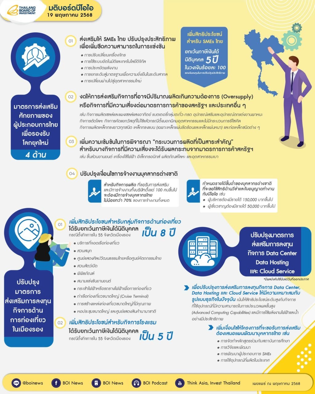 ส่งเสริมให้ SMEs ไทย ปรับปรุงประสิทธิภาพ โดยออกมาตรการพิเศษเพื่อกระตุ้นให้ SMEs ไทย ลงทุนปรับปรุงประสิทธิภาพ เพื่อเพิ่มขีดความสามารถในการแข่งขัน เช่น การปรับเปลี่ยนเครื่องจักร การใช้ระบบอัตโนมัติและเทคโนโลยีดิจิทัล การประหยัดพลังงาน การยกระดับสู่มาตรฐานเพื่อความยั่งยืนในระดับสากล รวมทั้งการเปลี่ยนผ่านไปสู่อุตสาหกรรมใหม่ โดยเพิ่มสิทธิประโยชน์แก่ SMEs ไทย จากเดิมยกเว้นภาษีเงินได้ 3 ปี ในวงเงินไม่เกินร้อยละ 50 ของเงินลงทุนในการปรับปรุงประสิทธิภาพ ปรับเพิ่มขึ้นเป็นยกเว้นภาษีเงินได้ 5 ปี ในวงเงินร้อยละ 100งดให้การส่งเสริมกิจการที่อาจมีปริมาณผลิตเกินความต้องการ (Oversupply) หรือกิจการที่มีความเสี่ยงต่อมาตรการการค้าของสหรัฐ และประเทศอื่น ๆ เช่น กิจการผลิตเซลล์และแผงเซลล์แสงอาทิตย์ แบตเตอรี่กลุ่มตะกั่ว-กรด อุปกรณ์เสริมและอุปกรณ์ตกแต่งยานพาหนะ กิจการตัดโลหะ กิจการคัดแยกวัสดุที่ไม่ใช้แล้วกรณีตั้งนอกนิคมอุตสาหกรรมและไม่มีกระบวนการรีไซเคิล นอกจากนี้ ยังจะงดส่งเสริมกิจการเหล็กขั้นปลายเพิ่มเติมจากเดิม ได้แก่ กิจการผลิตเหล็กทรงยาวทุกชนิด เหล็กทรงแบน (เฉพาะเหล็กแผ่นรีดร้อนและเหล็กแผ่นหนา) และท่อเหล็กชนิดต่าง ๆเพิ่มความเข้มข้นในการพิจารณากระบวนการผลิตที่เป็นสาระสำคัญ สำหรับบางกิจการที่มีความเสี่ยงจะได้รับผลกระทบจากมาตรการการค้าสหรัฐ เช่น ชิ้นส่วนยานยนต์ เครื่องใช้ไฟฟ้า อิเล็กทรอนิกส์ ผลิตภัณฑ์โลหะ และอุตสาหกรรมเบา โดยกำหนดเป็นเงื่อนไขชัดเจนว่า ต้องมีกระบวนการผลิตที่เป็นสาระสำคัญ โดยมีการแปรสภาพวัตถุดิบหลักเป็นผลิตภัณฑ์อย่างเพียงพอ เช่น มีการเปลี่ยนพิกัดศุลกากรอย่างน้อยในระดับ 4 หลัก เพื่อให้การผลิตเพื่อส่งออกของไทยเป็นที่ยอมรับและเกิดประโยชน์ต่อประเทศชัดเจนมากยิ่งขึ้นปรับปรุงเงื่อนไขการจ้างงานบุคลากรต่างชาติ สำหรับกิจการผลิตที่ขอรับการส่งเสริมลงทุนและมีการจ้างงานทั้งบริษัทตั้งแต่ 100 คนขึ้นไป จะต้องมีการจ้างบุคลากรไทยไม่น้อยกว่าร้อยละ 70 ของการจ้างงานทั้งหมด นอกจากนี้ จะกำหนดรายได้ขั้นต่ำของบุคลากรต่างชาติที่จะขอใช้สิทธิด้านวีซ่าและใบอนุญาตทำงานกับบีโอไอ เช่น ถ้าเป็นระดับผู้บริหาร ต้องมีรายได้ 150,000 บาทขึ้นไป และระดับผู้เชี่ยวชาญ 50,000 บาทขึ้นไป เพื่อสร้างสมดุลการจ้างงานในประเทศให้เหมาะสม หลีกเลี่ยงการแย่งงานบุคลากรไทย และกระตุ้นให้เกิดการถ่ายทอดองค์ความรู้แก่บุคลากรไทยมากขึ้น ในขณะเดียวกันก็ยังสามารถดึงดูดผู้เชี่ยวชาญจากต่างประเทศ ให้มาช่วยสร้างมูลค่าเพิ่มแก่เศรษฐกิจ