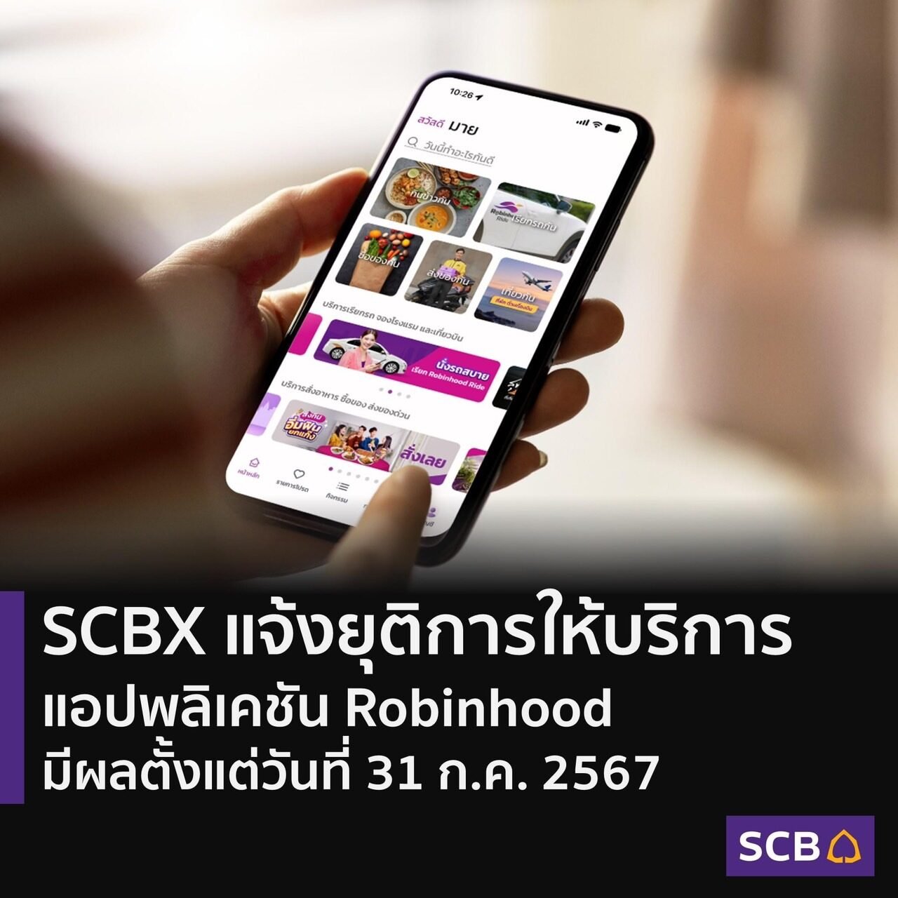 หลังจากบริษัท เอสซีบี เอกซ์ จำกัด (มหาชน) หรือ SCBX บริษัทแม่ของบริษัท เพอร์เพิล เวนเจอร์ส จำกัด ผู้ให้บริการแอปพลิเคชัน Robinhood ได้ประกาศเตรียมยุติการให้บริการของแอปฯ Robinhood ซึ่งเป็นแอปส่งอาหารสัญชาติไทยแห่งแรก จะมีผลตั้งแต่วันที่ 31 กรกฎาคม 2567 เวลา 20.00 น. เป็นต้นไป หลังจากบรรลุภารกิจช่วยเหลือร้านค้า ไรเดอร์ และคนตัวเล็กในช่วงวิกฤตโควิดได้ตามเป้าประสงค์ที่ตั้งไว้