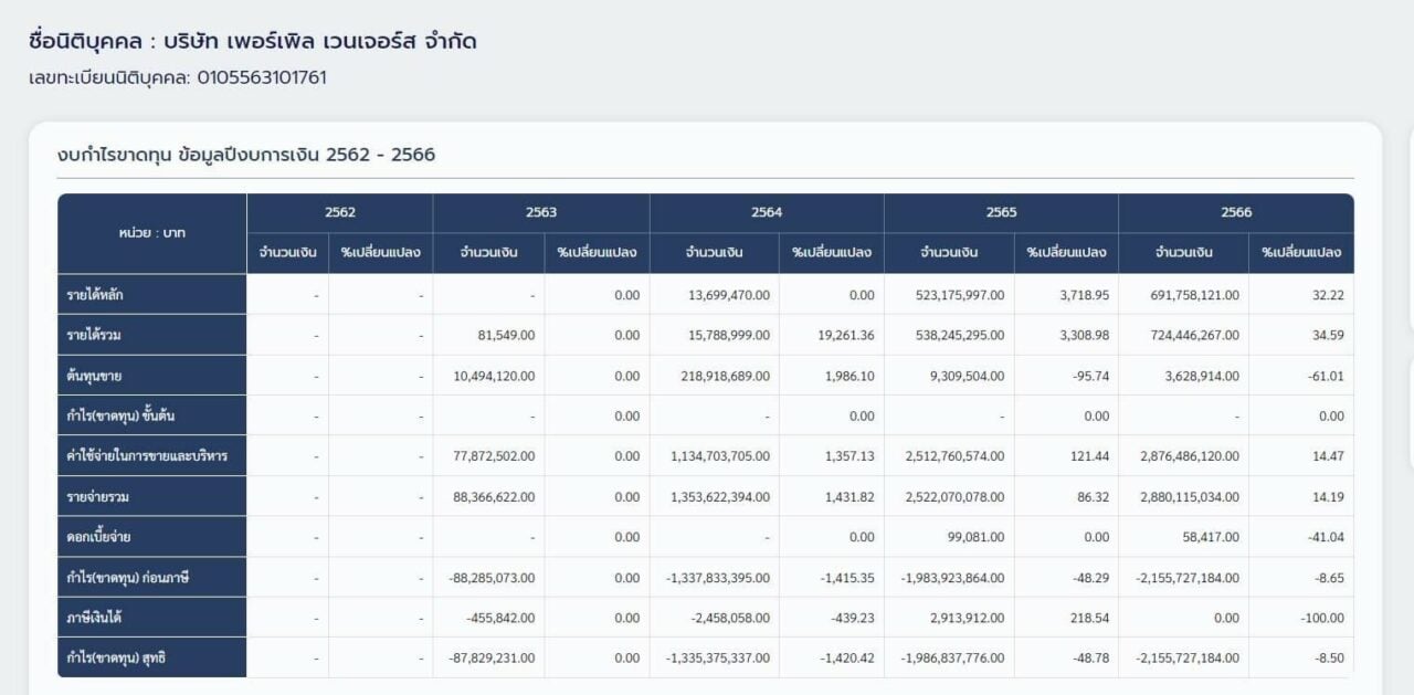 ปี 2563 ขาดทุน -87.829 ล้านบาทปี 2564 ขาดทุน -1,335 ล้านบาทปี 2565 ขาดทุน -1,986 ล้านบาทปี 2566 ขาดทุน -2,155 ล้านบาท