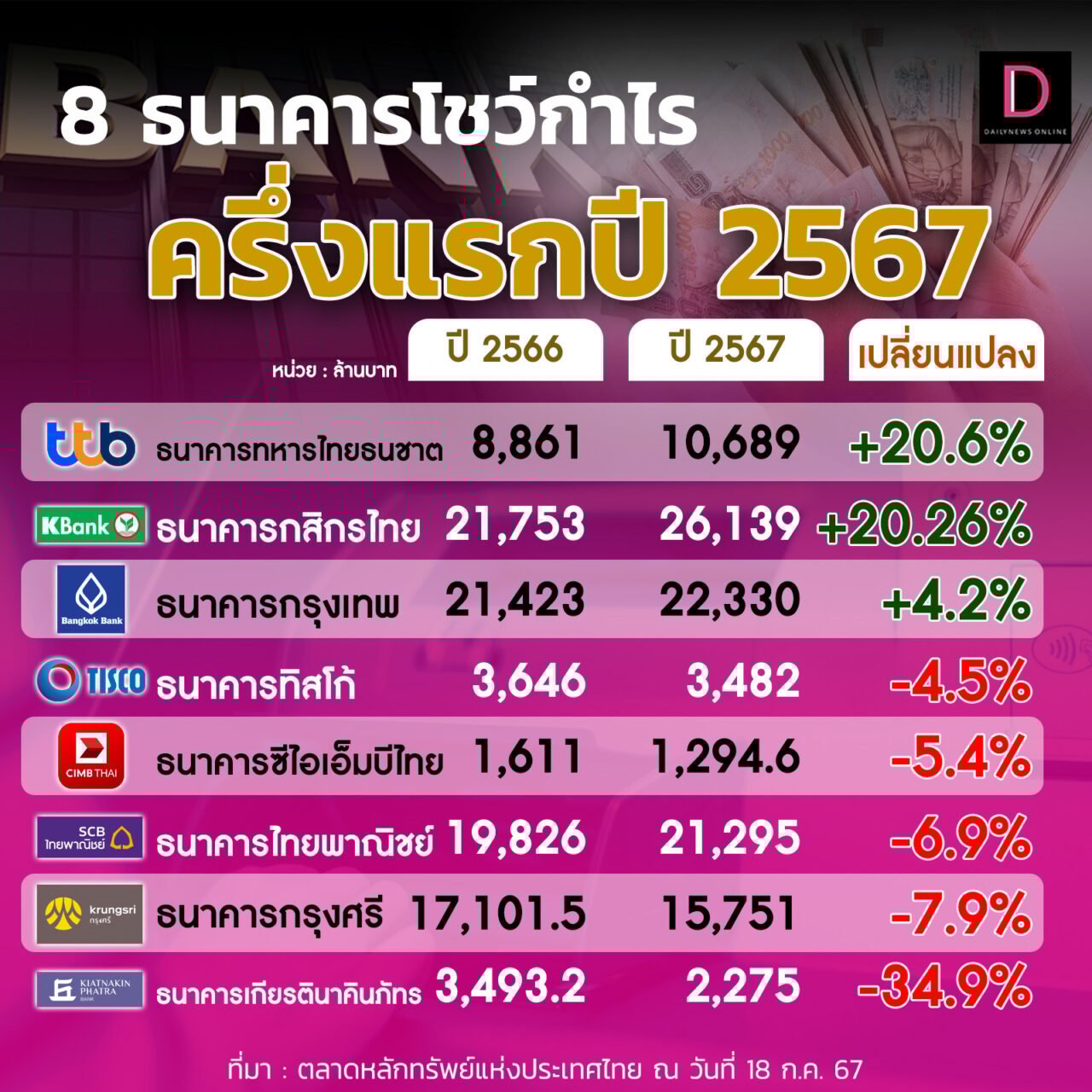 ทั้งนี้ ธนาคารกรุงเทพ มีกำไรสุทธิ 22,330 ล้านบาท เพิ่มขึ้น 4.2% ในช่วงเดียวกันของปีก่อน จากรายได้ดอกเบี้ยเพิ่มขึ้น,ธนาคารกสิกรไทย มีกำไรสุทธิ 26,139 ล้านบาท เพิ่มขึ้น 20.26% ในช่วงเดียวกันของปีก่อน จากการบริหารค่าใช้จ่ายที่มีคุณภาพ,ธนาคารกรุงศรีอยุธยา มีกำไรสุทธิ 15,751 ล้านบาท ลดลง 7.9% ในช่วงเดียวกันของปีก่อน จากการตั้งสำรองเพิ่มขึ้น,ธนาคารซีไอเอ็มบีไทย มีกำไรสุทธิ 1,294.6 ล้านบาท ลดลง 5.4% ในช่วงเดียวกันของปีก่อน จากรายได้ที่ลดลง