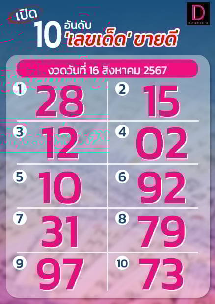 เมื่อจัดลำดับความนิยมของเลขดัง 10 อันดับ พบมีดังนี้ อันดับ 1 เลข 28 อันดับ 2 เลข 15 อันดับ 3 เลข 12 อันดับ 4 เลข 02 อันดับ 5 เลข 10 อันดับ 6 เลข 92 อันดับ 7 เลข 31 อันดับ 8 เลข 79 อันดับ 9 เลข 97 และอันดับ 10 เลข 73