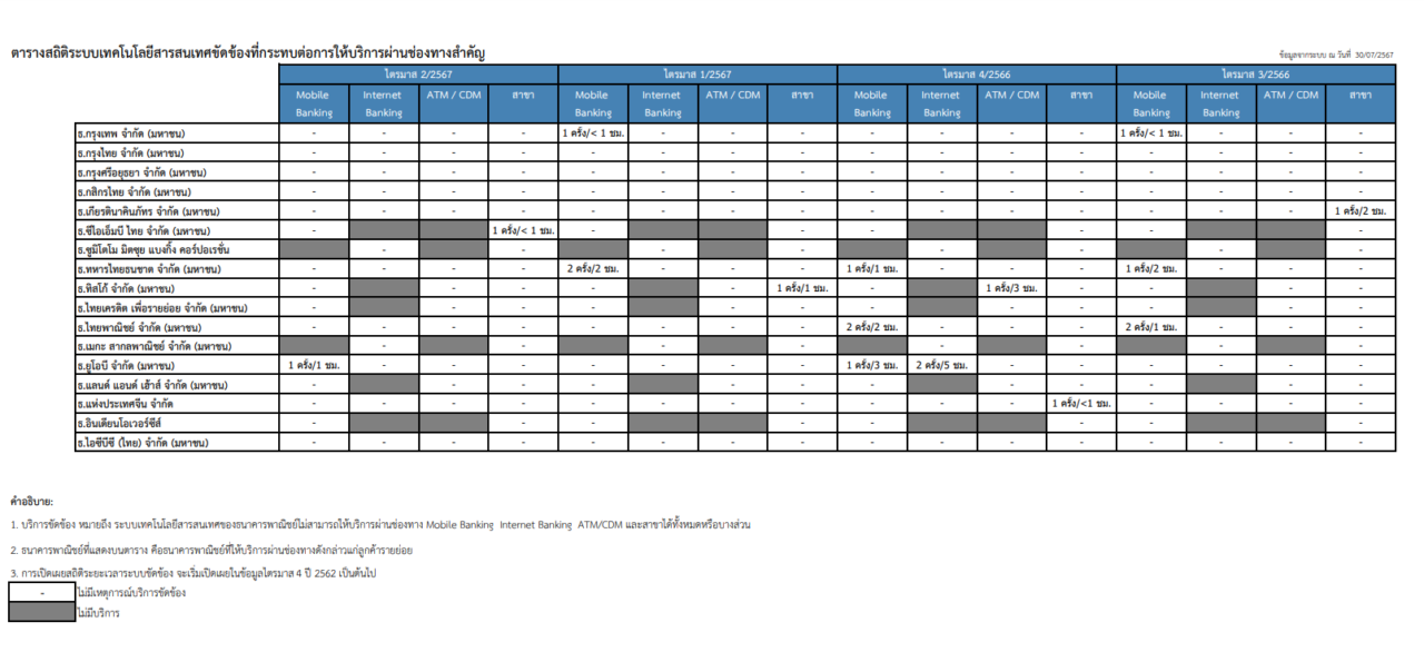 ธนาคารแห่งประเทศไทย (ธปท.) หรือแบงก์ชาติ ได้เผยแพร่สถิติระบบธนาคารพาณิชย์ขัดข้อง ทั้งโมบายแบงก์กิ้ง อินเทอร์เน็ตแบงก์กิ้ง ATM/CDM และสาขา ในช่วงไตรมาส 2 ปี 2567 หรือระหว่างช่วงเดือนเมษายน-มิถุนายน 2567 พบว่า ไม่มีธนาคารพาณิชย์ขนาดใหญ่แห่งไหนแอปล่ม หรือขัดข้องแม้แต่แบงก์เดียว