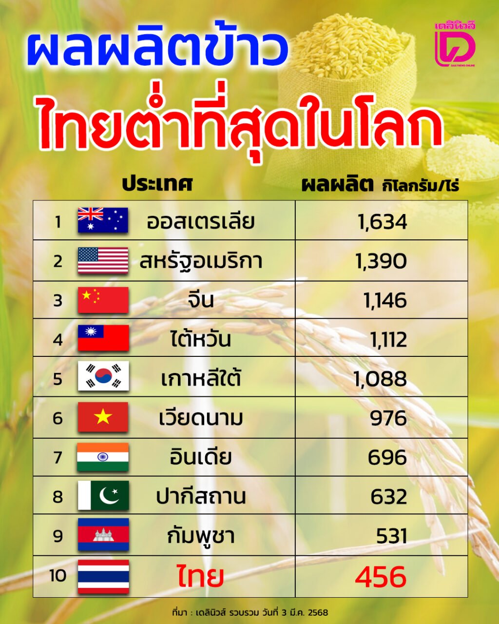 อินเดีย มีผลผลิตข้าว 696 กก./ไร่เวียดนาม ผลิตข้าว 976 กก./ไร่ปากีสถาน ผลิตข้าว 632 กก./ไร่สหรัฐ ผลิตข้าว 1,390 กก./ไร่จีน ผลิตข้าว 1,146 กก./ไร่ออสเตรเลีย ผลิตข้าว 1,634 กก./ไร่ไต้หวัน ผลิตข้าว 1,112 กก./ไร่เกาหลีใต้ ผลิตข้าว 1,088 กก./ไร่กัมพูชา ผลิตข้าว 531 กก./ไร่ไทย ผลิตข้าว 456 กก./ไร่