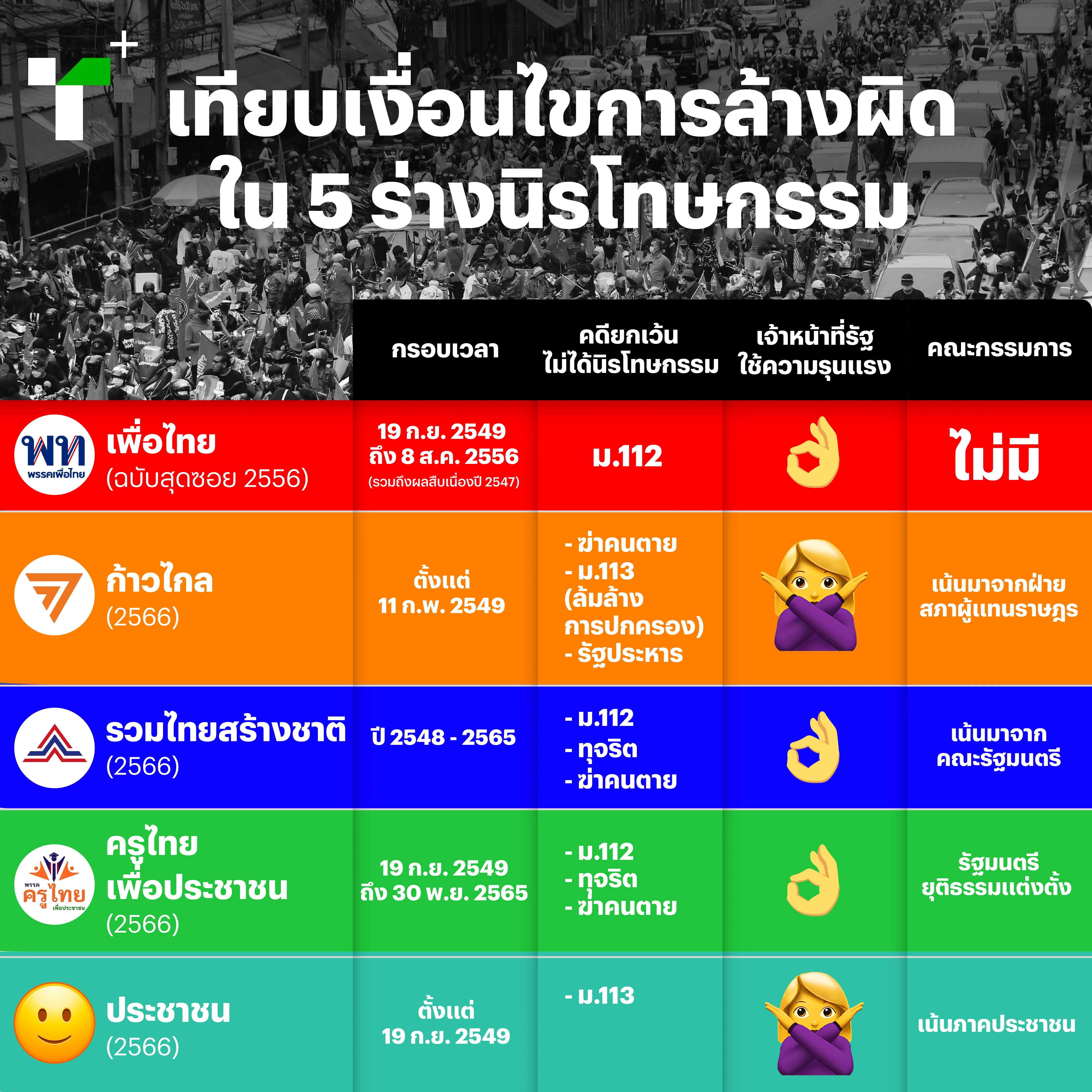 ทั้งนี้ จากร่าง พ.ร.บ.นิรโทษกรรม ที่ถูกเสนอ มีเพียง ร่าง พ.ร.บ.นิรโทษกรรมประชาชน ที่ถูกเสนอโดยภาคประชาชนเท่านั้น ที่มีการกำหนดให้ผู้ต้องหาหรือผู้ต้องขังในคดีตามประมวลกฎหมายอาญา มาตรา 112 ได้รับการนิรโทษกรรม ในขณะที่กฎหมายอื่นๆ เช่น ของพรรคก้าวไกล ยังไม่มีความชัดเจน แต่ใช้กลไกของคณะกรรมการวินิจฉัยในการชี้ขาด ส่วนข้อเสนอจากพรรครวมไทยสร้างชาติ มีการระบุอย่างชัดเจนว่า มีข้อยกเว้นไม่นิรโทษกรรมให้กับผู้ที่ละเมิดกฎหมายอาญา มาตรา 112