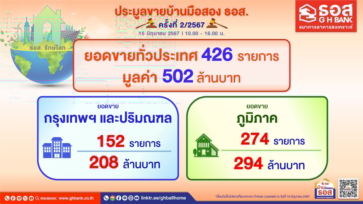 ธอส. เผยผลการจัดงานประมูลขายบ้านมือสอง ธอส. ประจำปี ครั้งที่ 2/2567 จำหน่ายได้ 426 รายการ มูลค่ารวมกว่า 502 ล้านบาท