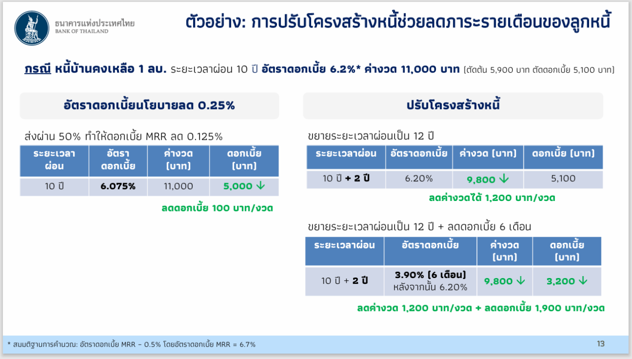3.ปรับโครงสร้างหนี้ โดยขยายเวลาผ่อนเป็น 12 ปี และลดดอกเบี้ย 6 เดือน