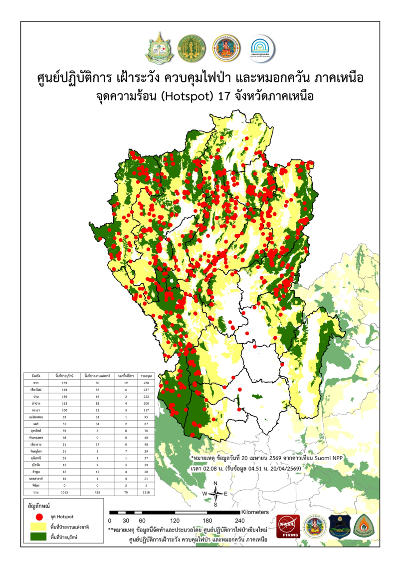ศูนย์ปฏิบัติการไฟป่าภาคเหนือ รายงานข้อมูลจุดความร้อนจากดาวเทียม Suomi NPP ประจำวันที่ 20 เม.ย. พบไฟป่าทั้งหมด 1,518 จุด ป่าอนุรักษ์มากสุด 1,013 จุด ตากและเชียงใหม่ยังคงเป็นจังหวัดที่ไฟลุกหนักที่สุดวันนี้ (20 เม.ย.2569) กรมอุทยานแห่งชาติ สัตว์ป่า และพันธุ์พืช โดยศูนย์ปฏิบัติการเฝ้าระวัง ควบคุมไฟป่า และหมอกควัน ภาคเหนือ เปิดเผยรายงานสถานการณ์ไฟป่าล่าสุดประจำวันที่ 20 เม.ย.2569 จากข้อมูลดาวเทียม Suomi NPP ในระบบ VIIRS รอบเวลา 02.08 น. พบว่าสถานการณ์ไฟป่าในพื้นที่ 17 จังหวัดภาคเหนือยังคงทวีความรุนแรงอย่างน่ากังวล โดยตรวจพบจุดความร้อนรวมทั้งสิ้น 1,518 จุด