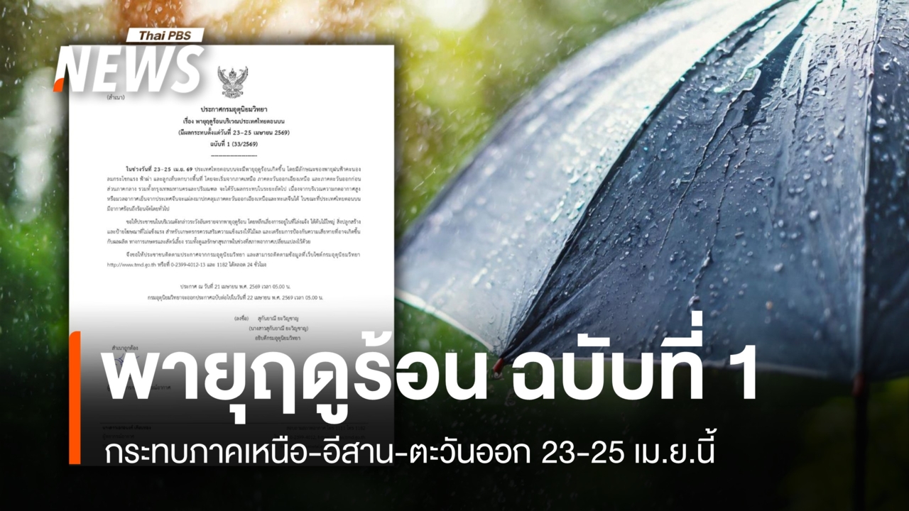 กรมอุตุนิยมวิทยา ออกประกาศฉบับที่ 1 เตือนพายุฤดูร้อนจะเกิดขึ้นในประเทศไทยตอนบนระหว่างวันที่ 23-25 เม.ย.2569 โดยมีฝนฟ้าคะนอง ลมกระโชกแรง ฟ้าผ่า และลูกเห็บตกบางพื้นที่ เริ่มจากภาคเหนือ ภาคตะวันออกเฉียงเหนือ และภาคตะวันออกก่อนวันนี้ (21 เม.ย.2569) กรมอุตุนิยมวิทยา ออกประกาศเรื่อง "พายุฤดูร้อนบริเวณประเทศไทยตอนบน" ฉบับที่ 1 (33/2569) เวลา 05.00 น. ระบุว่า ในช่วงวันที่ 23-25 เม.ย.2569 ประเทศไทยตอนบนจะมีพายุฤดูร้อนเกิดขึ้น