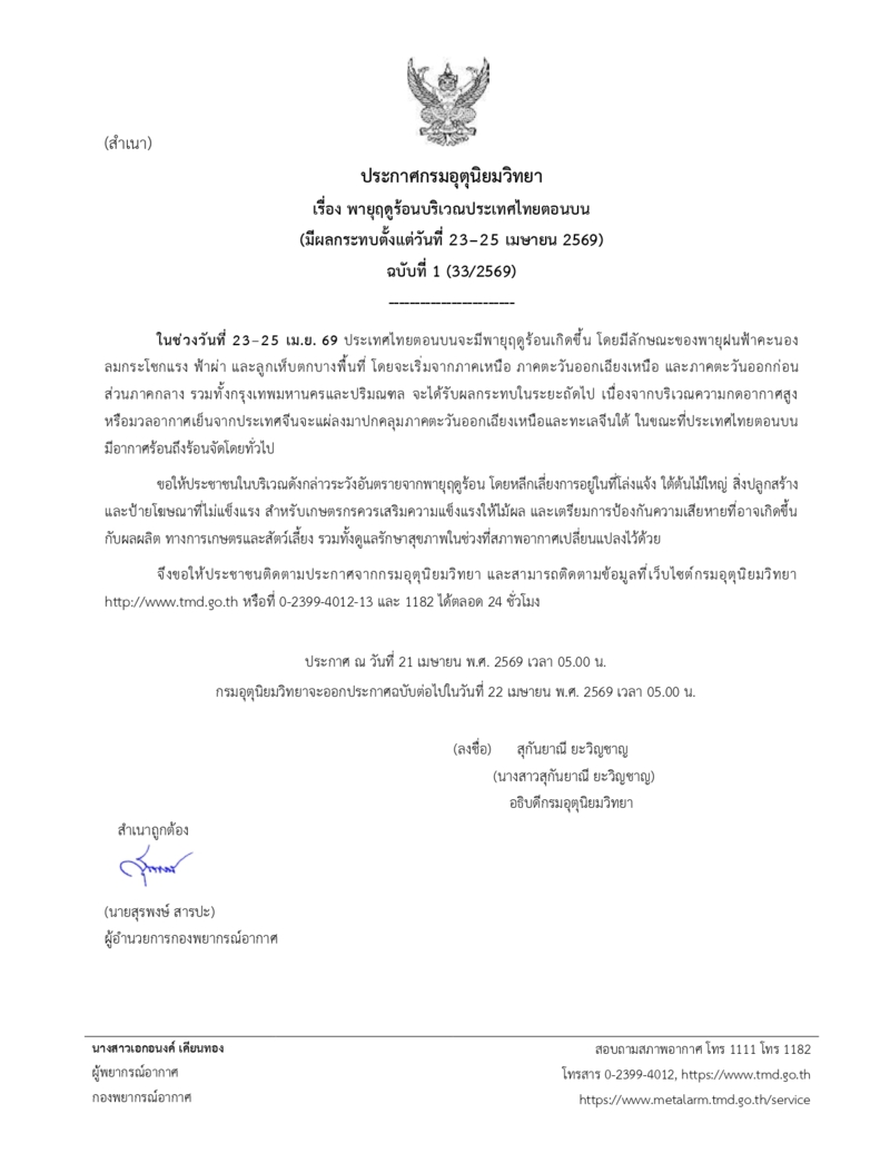 กรมอุตุนิยมวิทยาจะออกประกาศฉบับต่อไปในวันที่ 22 เม.ย.2569 เวลา 05.00 น. ขอให้ประชาชนติดตามข้อมูลล่าสุดได้ที่เว็บไซต์ www.tmd.go.th หรือสายด่วน 0-2399-4012-13 และ 1182 ซึ่งให้บริการตลอด 24 ชั่วโมง