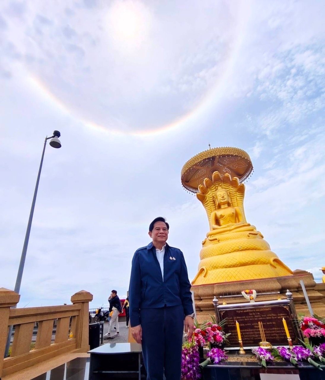น่าอัศจรรย์! พระอาทิตย์ทรงกลด 2 ชั้น ขณะ ‘พีระพันธุ์ สาลีรัฐวิภาค’ สักการะหลวงพ่อเจ็ดกษัตริย์ และยังพบงูจงอางขนาดใหญ่ แผ่แม่เบี้ยอยู่กลางถนน ในขณะที่รถขบวนแล่นผ่าน หลังเดินทางเยี่ยมชมโรงไฟฟ้าพลังน้ำลำตะคองชลภาวัฒนา