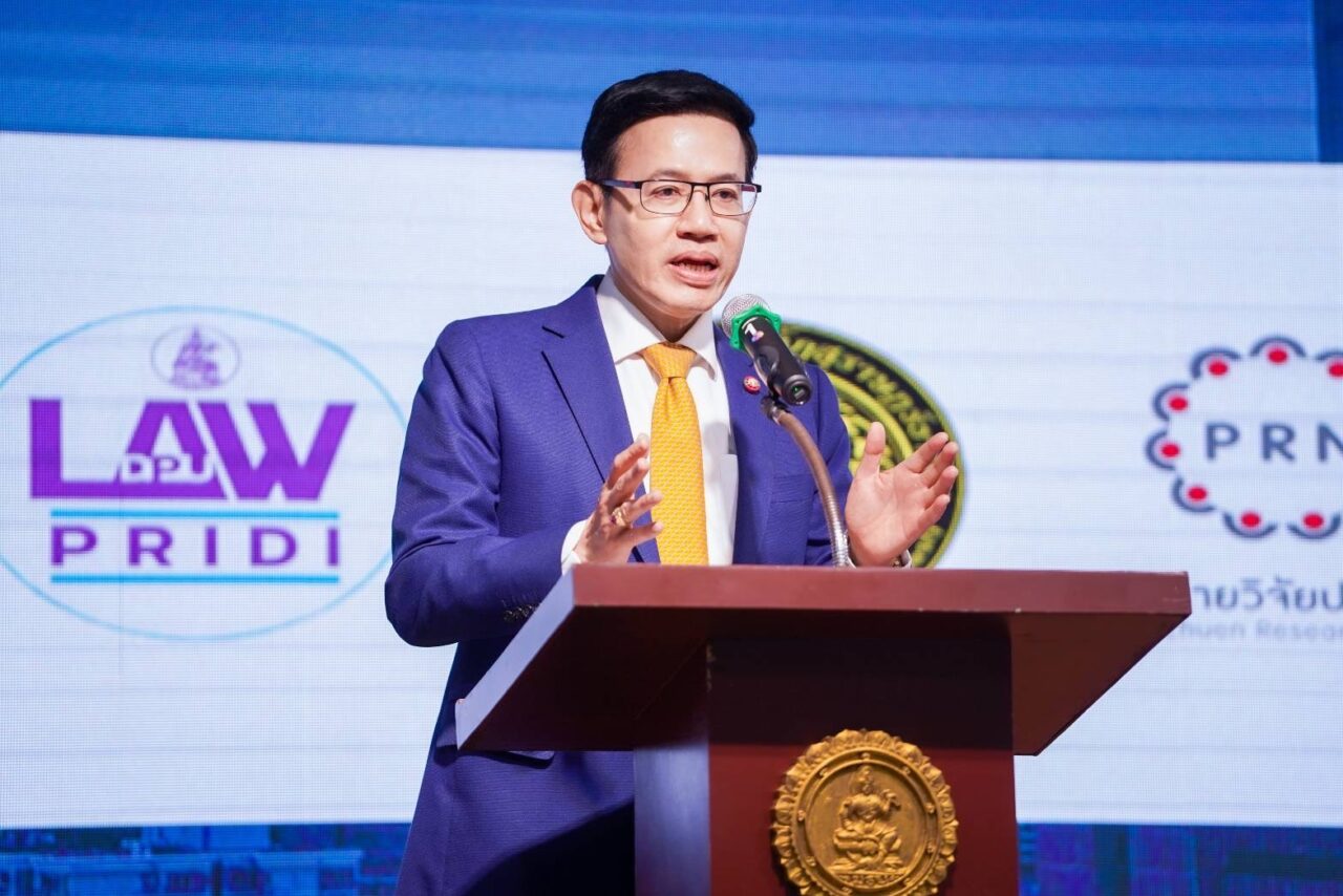โดยกล่าวในตอนหนึ่งว่า หากจะสร้างความเข้มแข็งให้กับหลักนิติธรรมและสังคมที่เป็นธรรม ต้องอาศัยการบูรณาการจากหลายศาสตร์การเรียนรู้ ไม่ใช่แค่นักกฎหมายและผู้บังคับใช้กฎหมายเท่านั้น ยังต้องอาศัยเครื่องมือทางเทคโนโลยีและนวัตกรรมการออกแบบนโยบาย เพื่อให้เกิดประสิทธิภาพและจะต้องมีกลไกที่ดูแลคุ้มครองสิทธิประโยชน์ของผู้บริโภคให้เกิดประสิทธิภาพ โดยการพัฒนากฎหมายยุคดิจิทัลควรจะมีลักษณะยืดหยุ่นทันสมัย และต้องคำนึงถึงว่ากฎหมายอาจจะถูกใช้เป็นเครื่องมือ เพื่อแสวงหาประโยชน์ในทางมิชอบได้ กฎหมายจึงควรต้องได้รับการตรวจสอบและปรับปรุงอย่างต่อเนื่อง เพื่อให้สอดคล้องกับการเปลี่ยนแปลงเทคโนโลยีและพฤติกรรมของผู้ใช้งานด้วย นอกจากนี้ในเวทีการประชุมวิชาการดังกล่าว ยังมีการจัดเสวนาวิชาการ ในหัวข้อ “การฟื้นฟูกิจการ-ทางรอดของธุรกิจหรือทางเลี่ยงกฎหมายกำกับดูแล : ทางออกและแนวทางการแก้ไขเพื่อความยุติธรรมที่ยั่งยืน โดยวัตถุประสงค์ เพื่อร่วมกันพัฒนากฎหมายและแนวทางการบังคับใช้กฎหมายให้ทันสมัย หาทางออกและแก้ไขปัญหาเกี่ยวกับกฎหมายล้มละลายและการฟื้นฟูกิจการ เพื่อส่งเสริมความยุติธรรมที่ยั่งยืนในสังคม
