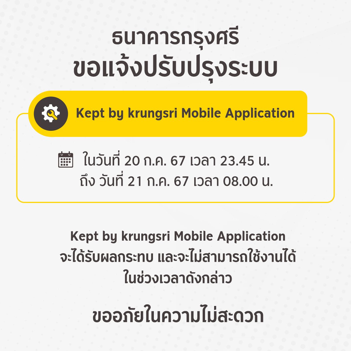 ธนาคารกรุงศรีอยุธยา ขอแจ้งปรับปรุง Kept by krungsri Mobile Application ชั่วคราว เพื่อทำการปรับปรุงระบบ ในวันที่ 20 กรกฎาคม 2567 เวลา 23.45 น. ถึงวันที่ 21 กรกฎาคม 2567 เวลา 08.00 น. บริการที่จะได้รับผลกระทบ และไม่สามารถใช้งานได้ มีดังนี้