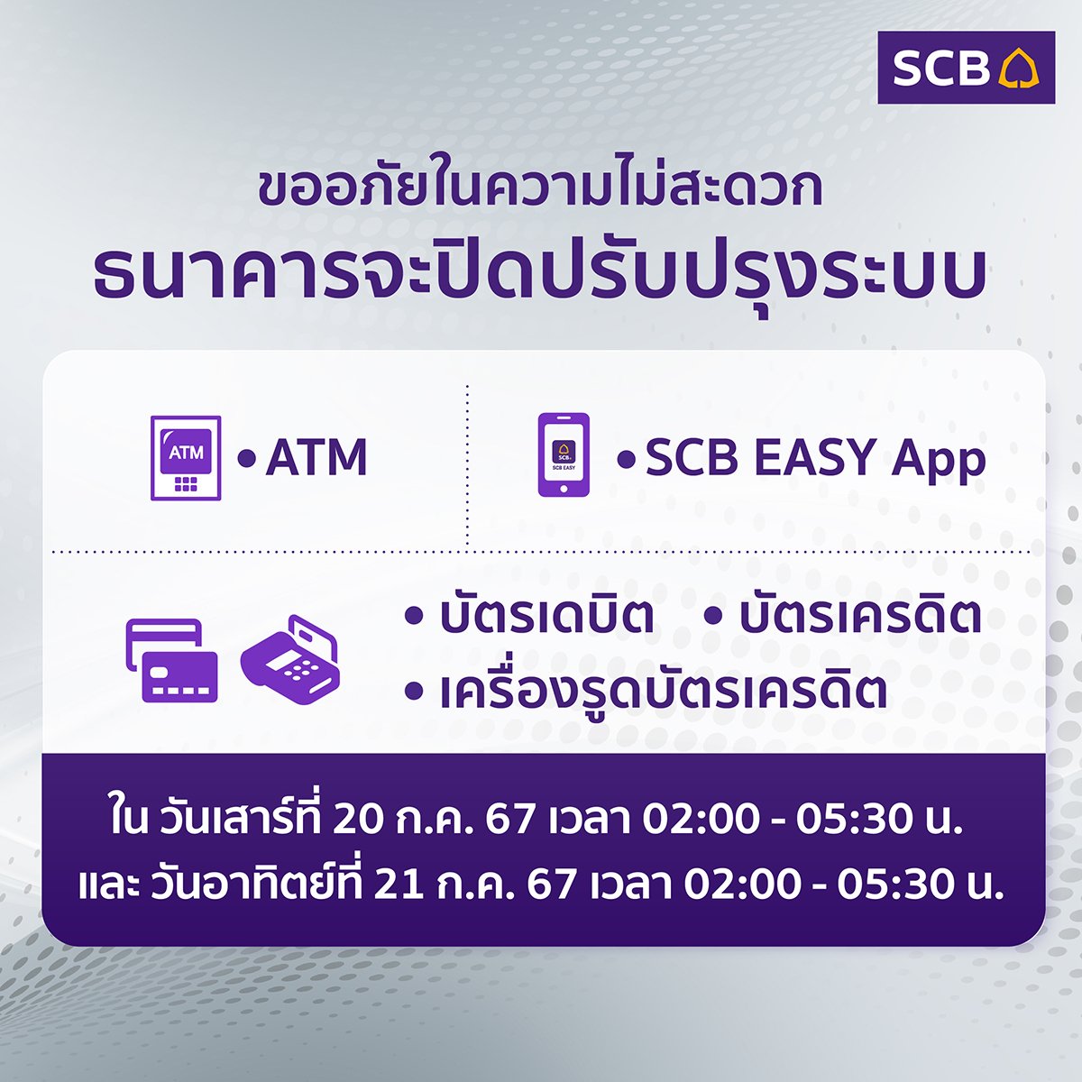 ธนาคารไทยพาณิชย์ ขอแจ้งปิดปรับปรุงระบบ SCB EASY App,ATM,บัตรเดบิต,บัตรเครดิต และเครื่องรูดบัตรเครดิตเป็นการชั่วคราว เพื่อพัฒนาและปรับปรุงประสิทธิภาพการให้บริการให้ดียิ่งขึ้น ในวันเสาร์ที่ 20 กรกฎาคม 2567 เวลา 02.00-05.30 น. และ วันอาทิตย์ที่ 21 กรกฎาคม 2567 เวลา 02.00-05.30 น. โดยในช่วงเวลาดังกล่าว จะไม่สามารถใช้บริการได้ กรุณาวางแผนในการทำธุรกรรมล่วงหน้า