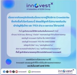 ด้าน Innovest X (บล.อินโนเวสท์ เอกซ์) แจ้งว่า เนื่องจากเกิดเหตุขัดข้องอันเนื่องมาจากผู้ให้บริการ Crowdstrike ซึ่งเกิดขึ้นทั่วโลกในขณะนี้ ส่งผลให้ลูกค้าไม่สามารถเติมเงินเข้าบัญชีหุ้นไทย และ TFEX ผ่าน e-service ได้ตามปกติ