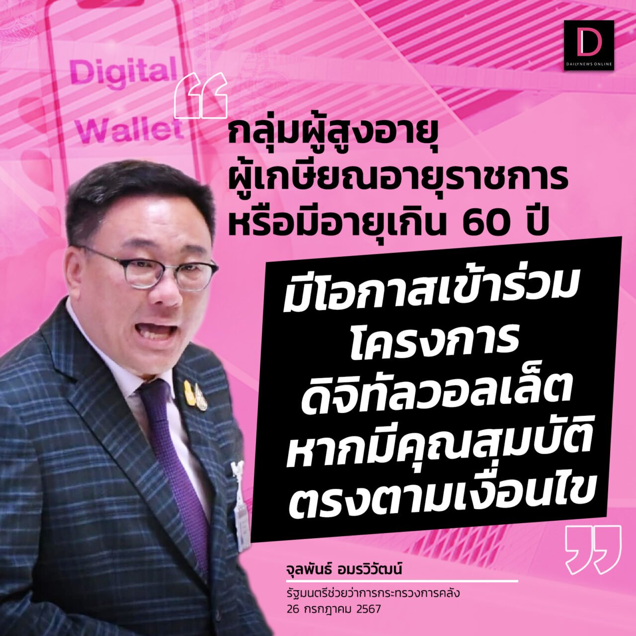 จากกรณีมีข้อกังวลว่า กลุ่มผู้สูงอายุ ผู้เกษียณอายุราชการ หรือมีอายุเกิน 60 ปี จะมีโอกาสเข้าร่วมโครงการดิจิทัลวอลเล็ต 10,000 บาท ได้หรือไม่