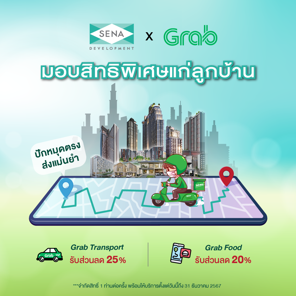 นางสาวอุมาพร ธัญลักษณ์ภาคย์ กรรมการ บริษัท เสนาดีเวลลอปเม้นท์ จำกัด (มหาชน) กล่าวว่า “เสนาให้ความสำคัญกับการส่งมอบที่อยู่อาศัยคุณภาพ มุ่งมั่นในการเป็นพาร์ทเนอร์คนสำคัญที่จะดูแลคุณภาพชีวิตของลูกบ้านในทุกช่วงอายุ เพื่อตอบโจทย์การใช้ชีวิตที่สะดวกสบาย โดยความร่วมมือครั้งนี้ เกิดจากความเข้าใจไลฟ์สไตล์และพฤติกรรมของลูกบ้านในปัจจุบันที่เปลี่ยนมาใช้บริการแพลตฟอร์มเดลิเวอรี่มากขึ้น เสนาจึงจับมือกับแกร็บ โดยการมอบสิทธิประโยชน์ให้ลูกบ้าน ในบริการขนส่ง (Grab Transport) รับส่วนลด 25% สูงสุด 40 บาท และบริการสั่งอาหาร (Grab Food) รับส่วนลด 20% สูงสุด 50 บาท (เมื่อสั่งซื้อขั้นต่ำ 150 บาทขึ้นไป) พร้อมให้บริการตั้งแต่วันนี้ถึง 31 ธันวาคม 2567 รวมถึงการอัพเดทฐานข้อมูล และพิกัดพื้นที่โครงการของเสนา เพื่อการให้บริการที่แม่นยำ อีกทั้งยังเพิ่มความสะดวกสบายแก่ลูกบ้านของเสนาที่อยู่อาศัยทั้งในคอนโดมิเนียม บ้านเดี่ยว และทาวน์โฮม กว่า 74 โครงการ มากกว่า 20,000 ครัวเรือน”
