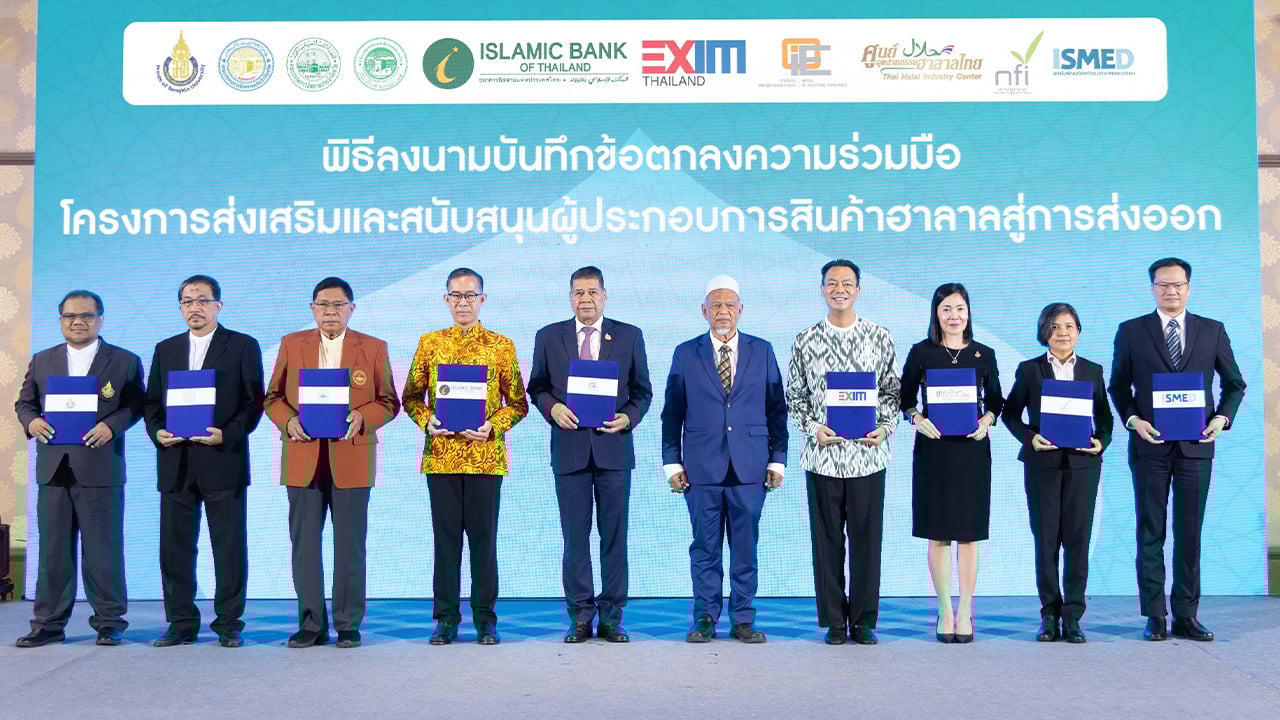 เพื่อส่งเสริมศักยภาพและสนับสนุนผู้ประกอบการไทย โดยเฉพาะ SMEs ให้สามารถส่งออกสินค้าฮาลาลสู่ตลาดโลกได้ ธนาคารเพื่อการส่งออกและนำเข้าแห่งประเทศไทย (EXIM BANK) ธนาคารอิสลามแห่งประเทศไทย (ibank) และหน่วยงานพันธมิตรรวม 14 หน่วยงาน อาทิ คณะกรรมการกลางอิสลามแห่งประเทศไทย ศูนย์อุตสาหกรรมฮาลาลไทย สถาบันอาหาร สถาบันพัฒนาวิสาหกิจขนาดกลางและขนาดย่อม และสถาบันฮาลาล มหาวิทยาลัยสงขลานครินทร์ ได้ร่วมลงนามบันทึกข้อตกลงความร่วมมือ “โครงการส่งเสริมและสนับสนุนผู้ประกอบการสินค้าฮาลาลสู่การส่งออก” โดยมุ่งหวังจะยกระดับศักยภาพของผู้ประกอบการ สร้างเครือข่ายระหว่างพันธมิตรเพื่อต่อยอดธุรกิจ องค์ความรู้ ประสบการณ์ และพัฒนาช่องทางการส่งออกสินค้าฮาลาลของไทย