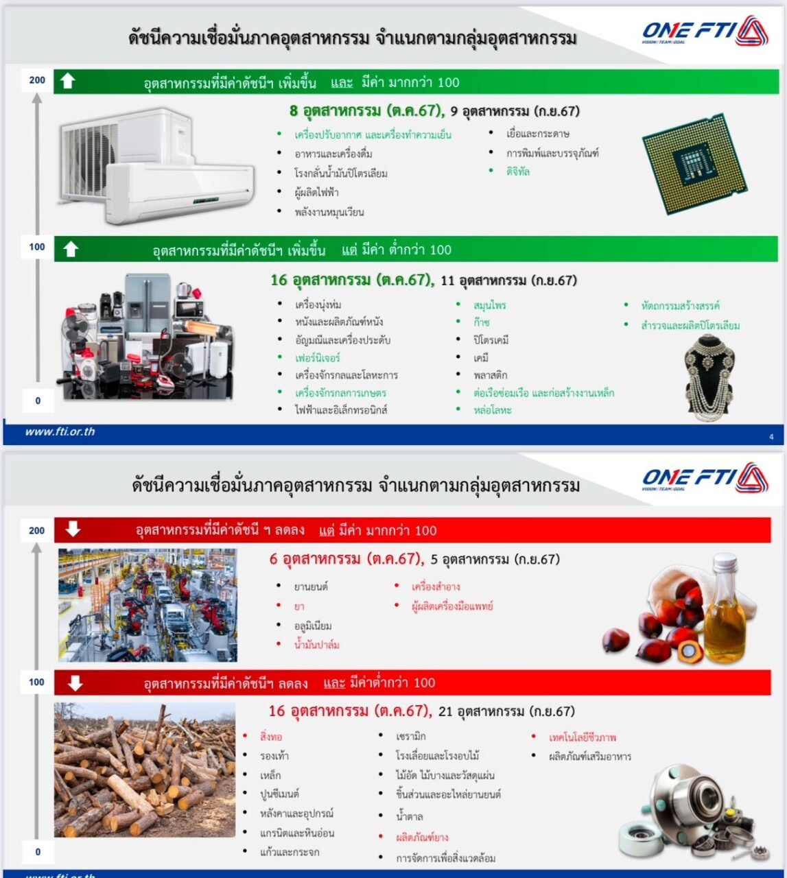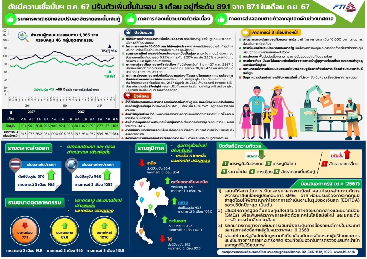 นายนาวา จันทนสุรคน รองประธานสภาอุตสาหกรรมแห่งประเทศไทย (ส.อ.ท.) กล่าวว่า ดัชนีความเชื่อมั่นภาคอุตสาหกรรมในเดือน ต.ค. 67 อยู่ที่ระดับ 89.1 เพิ่มขึ้นจาก 87.1 ในเดือน ก.ย. 67 เป็นการปรับเพิ่มขึ้นในรอบ 3 เดือน เนื่องจากสถานการณ์น้ำท่วมในหลายพื้นที่เริ่มคลี่คลาย ภาครัฐเร่งฟื้นฟูและเยียวยาความเสียหายให้กับประชาชน รวมถึงโครงการแจกเงิน 10,000 บาทให้กลุ่มเปราะบาง ทำให้ยอดขายสินค้าอุปโภคบริโภค เครื่องใช้ในบ้าน และอุปกรณ์การเกษตร และปุ๋ยเคมีดีขึ้น รวมทั้งธนาคารพาณิชย์ เริ่มทยอยปรับลดอัตราดอกเบี้ยเงินกู้ลง 0.25% ภายหลังคณะกรรมการนโยบายการเงิน (กนง.) ประกาศลดอัตราดอกเบี้ยนโยบายลง 0.25% จากระดับ 2.50% สู่ระดับ 2.25% ทำให้ต้นทุนทางการเงินของผู้ประกอบการลดลง