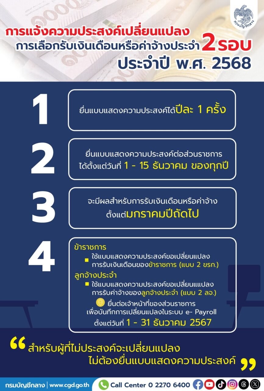 “ข้าราชการและลูกจ้างประจำ สามารถยื่นเอกสารแสดงความประสงค์ขอเปลี่ยนแปลงการรับเงินเดือนของข้าราชการและการรับค่าจ้างของลูกจ้างประจำ ได้ปีละ 1 ครั้ง โดยยื่นแบบแสดงความประสงค์ต่อส่วนราชการได้ตั้งแต่วันที่ 1-15 ธันวาคม ของทุกปี ซึ่งจะมีผลสำหรับการรับเงินเดือนหรือค่าจ้างตั้งแต่เดือนมกราคมปีถัดไป โดยใช้แบบแสดงความประสงค์ขอเปลี่ยนแปลงการรับเงินเดือนของข้าราชการ (แบบ 2 ขรก.) และแบบแสดงความประสงค์ขอเปลี่ยนแปลงการรับค่าจ้างของลูกจ้างประจำ (แบบ 2 ลจ.) ยื่นต่อเจ้าหน้าที่ของส่วนราชการ เพื่อบันทึกการเปลี่ยนแปลงในระบบ e-Payroll ตั้งแต่วันที่ 1-31 ธันวาคม 2567 หากพ้นระยะเวลาที่กำหนด ระบบจะปิดไม่ให้บันทึกรายการได้”