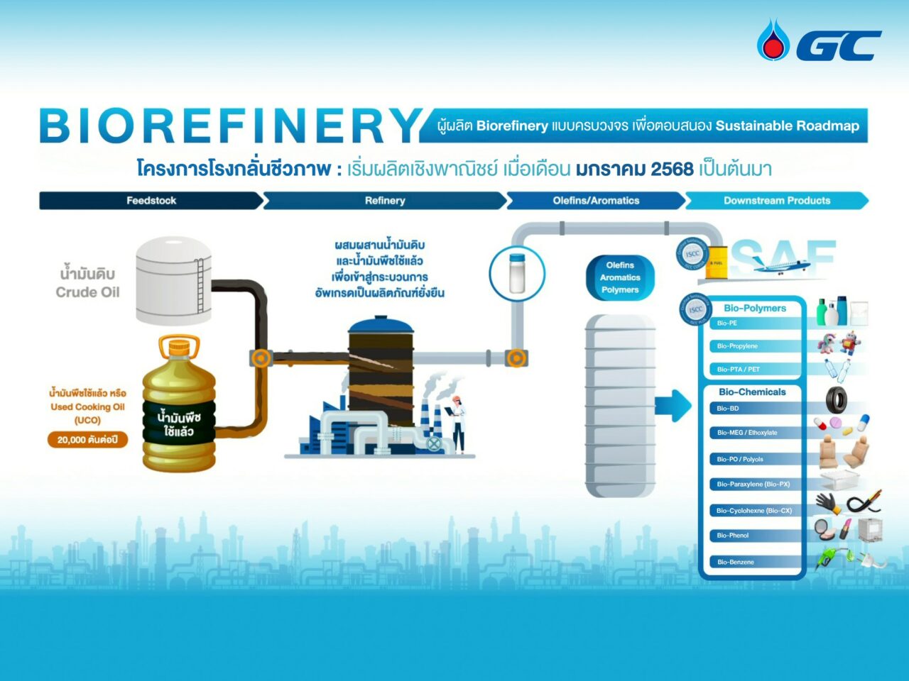 บริษัท พีทีที โกลบอล เคมิคอล จำกัด (มหาชน) หรือ GC ผู้นำในธุรกิจเคมีภัณฑ์ระดับสากล เพื่อสร้างสรรค์คุณภาพชีวิต เดินหน้าขยายศักยภาพโรงกลั่นชีวภาพ (Biorefinery) ต่อยอดจากความสำเร็จในการผลิตเชื้อเพลิงอากาศยานแบบยั่งยืน (Sustainable Aviation Fuel: SAF) เป็นรายแรกของประเทศ สู่การพัฒนาผลิตภัณฑ์เคมีชีวภาพ (Bio-Chemicals) และพลาสติกชีวภาพ (Bio-Polymers) มูลค่าสูงที่ตอบโจทย์การใช้งานในหลากหลายอุตสาหกรรม รองรับความต้องการของตลาดโลกที่มุ่งสู่วัสดุทางเลือกเพื่อความยั่งยืน เสริมความแข็งแกร่งให้กับอุตสาหกรรมชีวภาพของไทย และเพิ่มขีดความสามารถในการแข่งขันในระดับสากล ด้วยเทคโนโลยีและนวัตกรรมที่แตกต่างอย่างยั่งยืน พร้อมขับเคลื่อนองค์กรตามกลยุทธ์ขยายธุรกิจมูลค่าสูงและคาร์บอนต่ำ (High Value & Low Carbon Business)