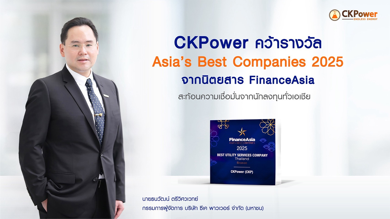 เมื่อเร็ว ๆ นี้ บริษัท ซีเค พาวเวอร์ จำกัด (มหาชน) หรือ CKPower (ชื่อย่อหลักทรัพย์: CKP) หนึ่งในผู้นำในการผลิตไฟฟ้าจากพลังงานหมุนเวียนที่ใหญ่ที่สุดในภูมิภาคและมีคาร์บอนฟุตพรินต์ที่ต่ำที่สุดรายหนึ่ง ได้รับรางวัลระดับ Bronze ในกลุ่มบริษัทที่มีการบริหารจัดการที่ยอดเยี่ยม (Best Managed Company) จากเวทีประกาศรายชื่อสุดยอดบริษัทแห่งเอเชีย 2568 (Asia’s Best Companies Poll 2025) จัดโดยนิตยสาร FinanceAsia ฮ่องกง ซึ่งเป็นหนึ่งในสื่อด้านการเงินการลงทุนชั้นนำของภูมิภาค ซึ่งมอบรางวัลให้แก่องค์กรชั้นนำของเอเชีย จากการสำรวจความคิดเห็นของผู้จัดการกองทุน นักวิเคราะห์ นักลงทุน และนักวิเคราะห์ทั่วภูมิภาคเอเชีย โดยพิจารณาจากมิติแห่งความเป็นเลิศหลายปัจจัย อาทิ การวางกลยุทธ์องค์กรอย่างมีประสิทธิภาพ ความโปร่งใสในการสื่อสารกับนักลงทุน การเติบโตอย่างมั่นคงและยั่งยืน รวมถึงความสามารถในการปรับตัวและรักษาเสถียรภาพของธุรกิจ ท่ามกลางบริบทเศรษฐกิจที่เปลี่ยนแปลงอย่างต่อเนื่อง