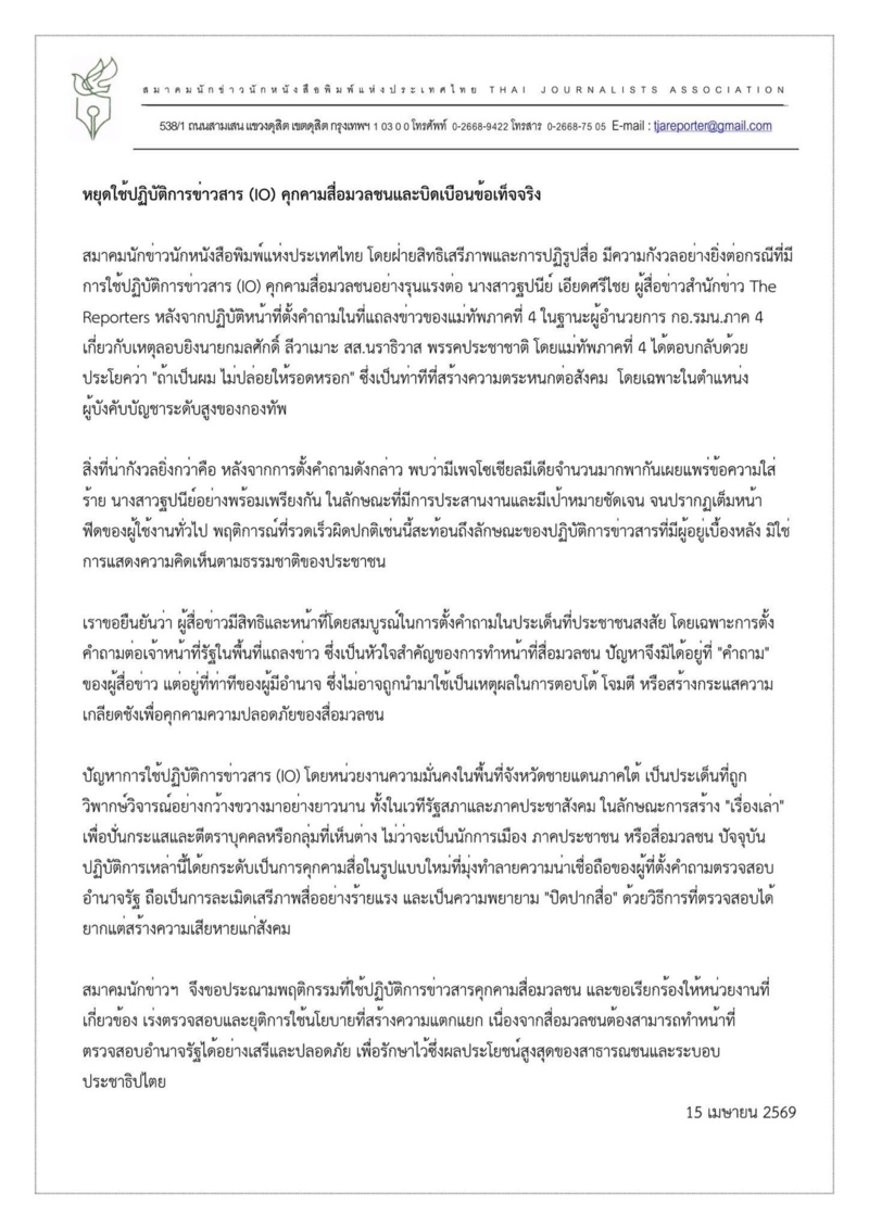 สมาคมนักข่าวฯ ประณามการใช้ปฏิบัติการ IO คุกคามสื่อและบิดเบือนข้อเท็จจริง เรียกร้องหน่วยงานเร่งตรวจสอบ หลังพบเพจโซเชียลฯ จำนวนมากโพสต์ข้อความใส่ร้ายนักข่าวที่ตั้งคำถามในวงแถลงข่าวของแม่ทัพภาค 4 เกี่ยวกับเหตุลอบยิง สส.นราธิวาสวันนี้ (15 เม.ย.2569) สมาคมนักข่าวนักหนังสือพิมพ์แห่งประเทศไทย ออกแถลงการณ์ต่อกรณีการใช้ปฏิบัติการข่าวสาร (IO) คุกคามสื่อมวลชน ระบุว่า สมาคมนักข่าวนักหนังสือพิมพ์แห่งประเทศไทย โดยฝ่ายสิทธิเสรีภาพและการปฏิรูปสื่อ มีความกังวลอย่างยิ่งต่อกรณีที่มีการใช้ปฏิบัติการข่าวสาร (IO) คุกคามสื่อมวลชนอย่างรุนแรงต่อ น.ส.ฐปนีย์ เอียดศรีไชย ผู้สื่อข่าวสำนักข่าว The Reporters หลังจากปฏิบัติหน้าที่ตั้งคำถามในที่แถลงข่าวของแม่ทัพภาคที่ 4 ในฐานะผู้อำนวยการ กอ.รมน.ภาค 4 เกี่ยวกับเหตุลอบยิงนายกมลศักดิ์ ลีวาเมาะ สส.นราธิวาส พรรคประชาชาติ โดยแม่ทัพภาคที่ 4 ได้ตอบกลับด้วยประโยคว่า "ถ้าเป็นผม ไม่ปล่อยให้รอดหรอก" ซึ่งเป็นท่าทีที่สร้างความตระหนกต่อสังคม โดยเฉพาะในตำแหน่งผู้บังคับบัญชาระดับสูงของกองทัพ