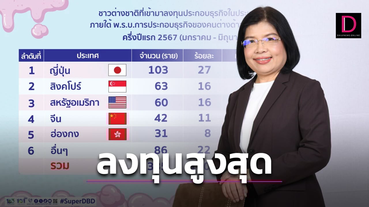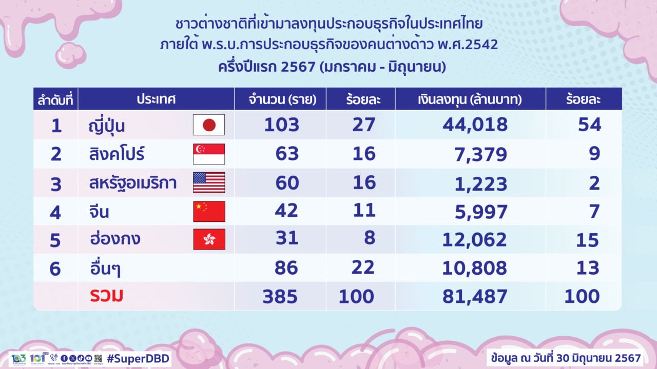 ครึ่งปีแรก‘67 ต่างชาติลงทุนในไทย 81,487 ล้านบาท ญี่ปุ่นลงทุนอันดับหนึ่ง 44,018 ล้านบาท ตามด้วย ฮ่องกง 12,062 ล้านบาท และสิงคโปร์ 7,379 ล้านบาท จ้างงานคนไทยกว่า 1,852 คน