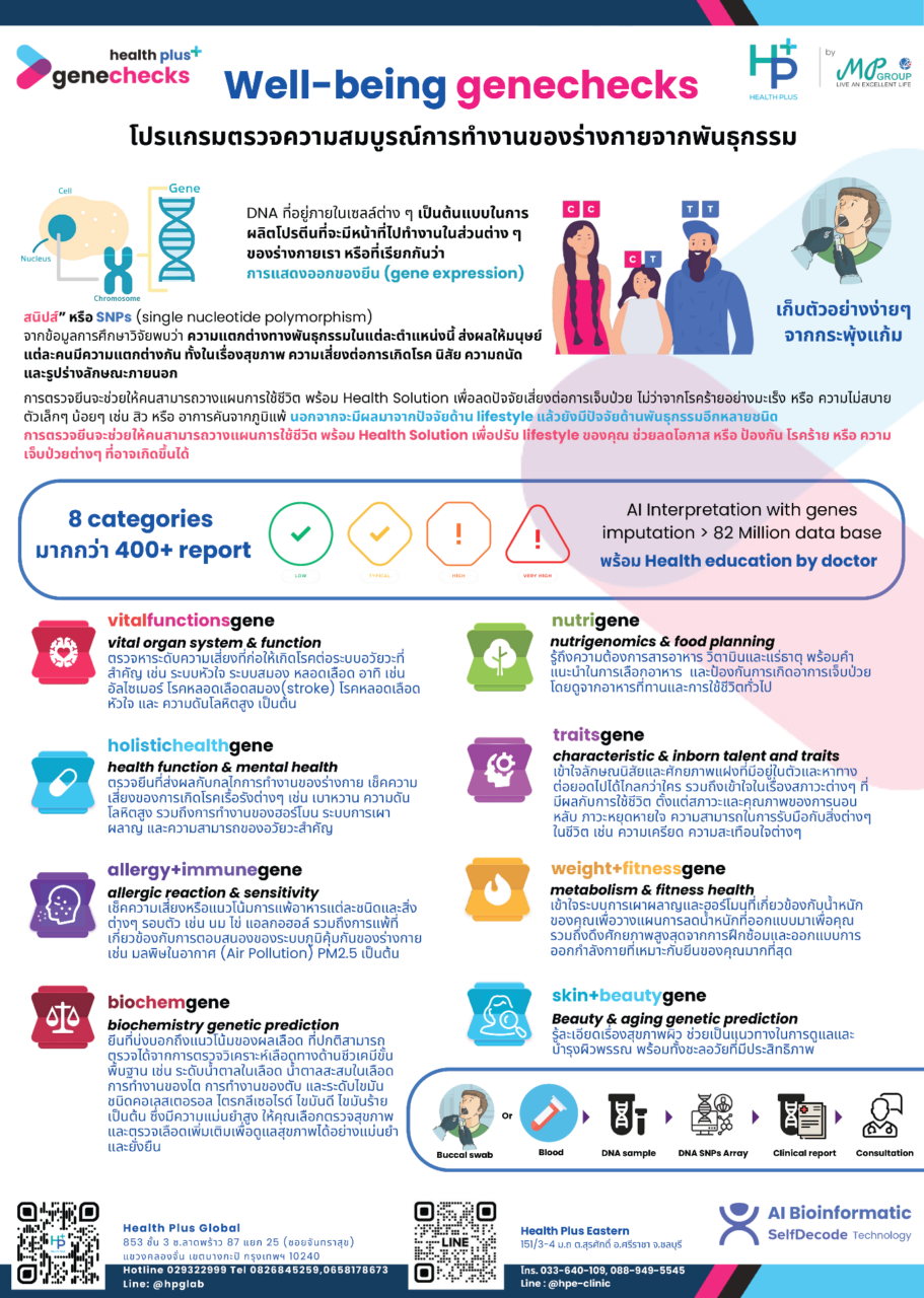 นอกจากนี้ MP Group ยังนำเสนอผลิตภัณฑ์ในกลุ่ม genechecks ได้แก่ Well-being ที่ตรวจความสมบูรณ์ในการทำงานของร่างกายในระดับยีน เป็นข้อมูลช่วยออกแบบการรักษาที่เฉพาะบุคคล (Personalized Medicine) โดยใช้เทคโนโลยีการตรวจลำดับสารพันธุกรรมและการแปลผลด้วยระบบ AI ซึ่งการเติบโตของธุรกิจนี้มีส่วนช่วยสร้างรายได้ให้แก่โรงพยาบาลและคลินิก รวมถึงส่งผลดีต่อภาคการท่องเที่ยว โรงแรม ร้านอาหาร และการขนส่ง ทำให้มีผลเชิงบวกต่อเศรษฐกิจโดยรวมของประเทศ