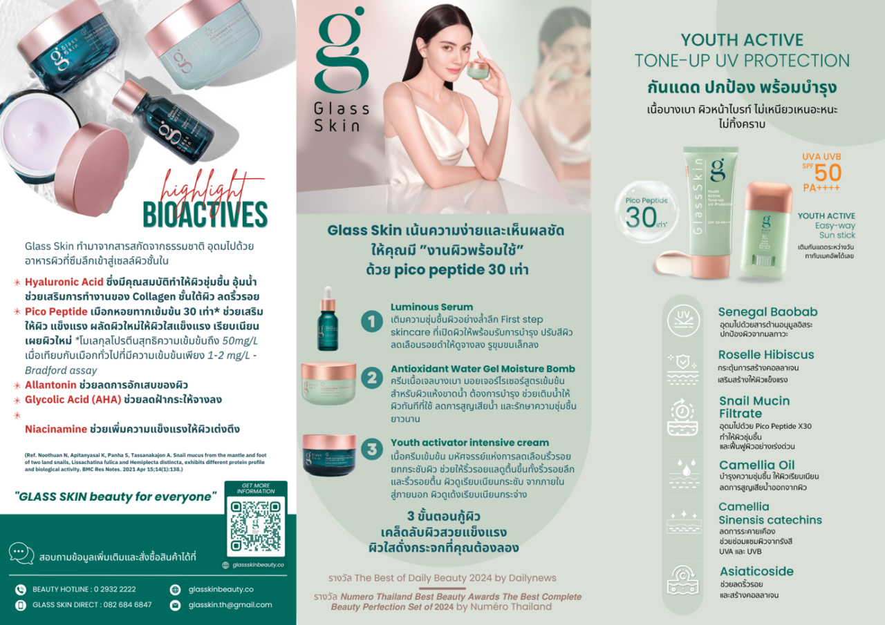 ในด้านผลิตภัณฑ์ทาง MP Group ยังมีผลิตภัณฑ์ Skincare คุณภาพสูง ยี่ห้อ Glass skin ที่ได้รับมาตรฐานมีผลงานวิจัยจากจุฬาลงกรณ์มหาวิทยาลัย และเป็น BCG Model ได้แก่ Luminous serum,Antioxidant Water Gel Moisture Bomb และ Youth Activator Intensive Cream พร้อมกับผลิตภัณฑ์ใหม่อย่าง Youth Active Tone-up UV Protection และ Youth Active Easy-way Sun Stick ที่เข้ามาเสริมสร้างความหลากหลายให้กับตลาด