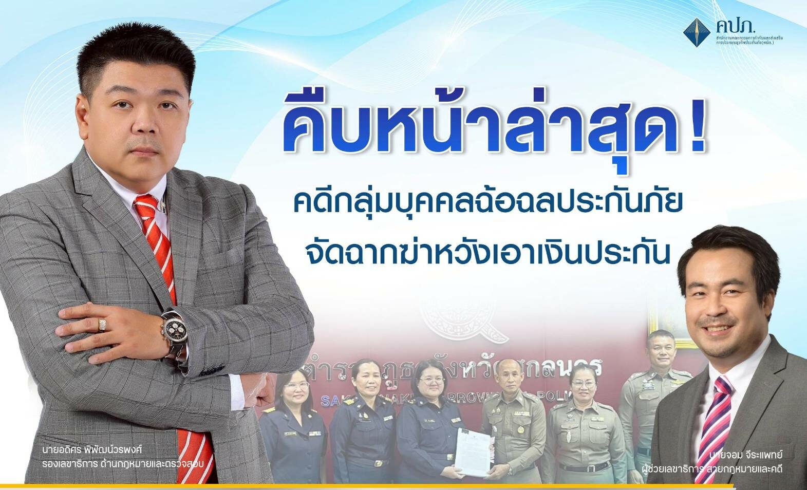 หรือแสดงหลักฐานอันเป็นเท็จในการเรียกร้อง อันเป็นการแสวงหาประโยชน์ที่มิชอบด้วยกฎหมาย ซึ่งเป็นความผิดฐานฉ้อฉลประกันภัย ตามมาตรา 108/4 แห่งพระราชบัญญัติประกันวินาศภัย พ.ศ. 2535 แก้ไขเพิ่มเติมโดยพระราชบัญญัติประกันวินาศภัย (ฉบับที่ 4) พ.ศ. 2562 ต่อรองผู้กำกับการ (สอบสวน) สถานีตำรวจภูธรเมืองสกลนคร ณ กองบังคับการตำรวจภูธร จังหวัดสกลนคร เมื่อวันที่ 20 มีนาคม 2568 ล่าสุด ตำรวจได้ดำเนินการจับกุมผู้ต้องหาจำนวน 5 ราย พร้อมแจ้งข้อหาร่วมกันฆ่าผู้อื่น โดยไตร่ตรองไว้ก่อน เพื่อหวังเงินประกัน ซึ่งเป็นข้อหาหลัก สำหรับความคืบหน้าในคดี สำนักงาน คปภ. จะรายงานให้ทราบต่อไป