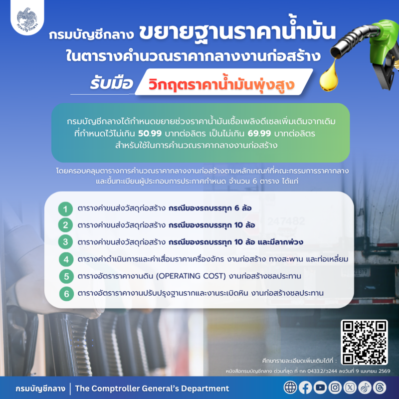 กรมบัญชีกลางจึงขยายช่วงราคาน้ำมันเชื้อเพลิงดีเซล จากเดิมที่กำหนดไว้ไม่เกิน 50.99 บาทต่อลิตร เป็นไม่เกิน 69.99 บาทต่อลิตร สำหรับใช้ในการคำนวณราคากลางงานก่อสร้าง โดยครอบคลุมตารางการคำนวณราคากลางงานก่อสร้าง ตามหลักเกณฑ์ที่คณะกรรมการราคากลาง และขึ้นทะเบียนผู้ประกอบการประกาศกำหนด จำนวน 6 ตาราง ได้แก่