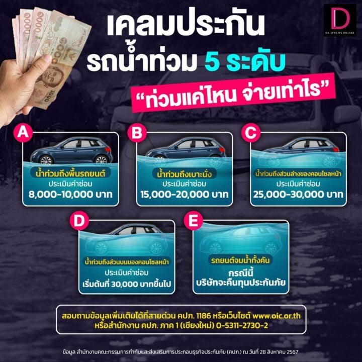 คปภ. แนะไกด์ไลน์ ซ่อมรถน้ำท่วม “ท่วมแค่ไหน จ่ายเคลมซ่อมเท่าไร” เช็กได้เลยที่นี่