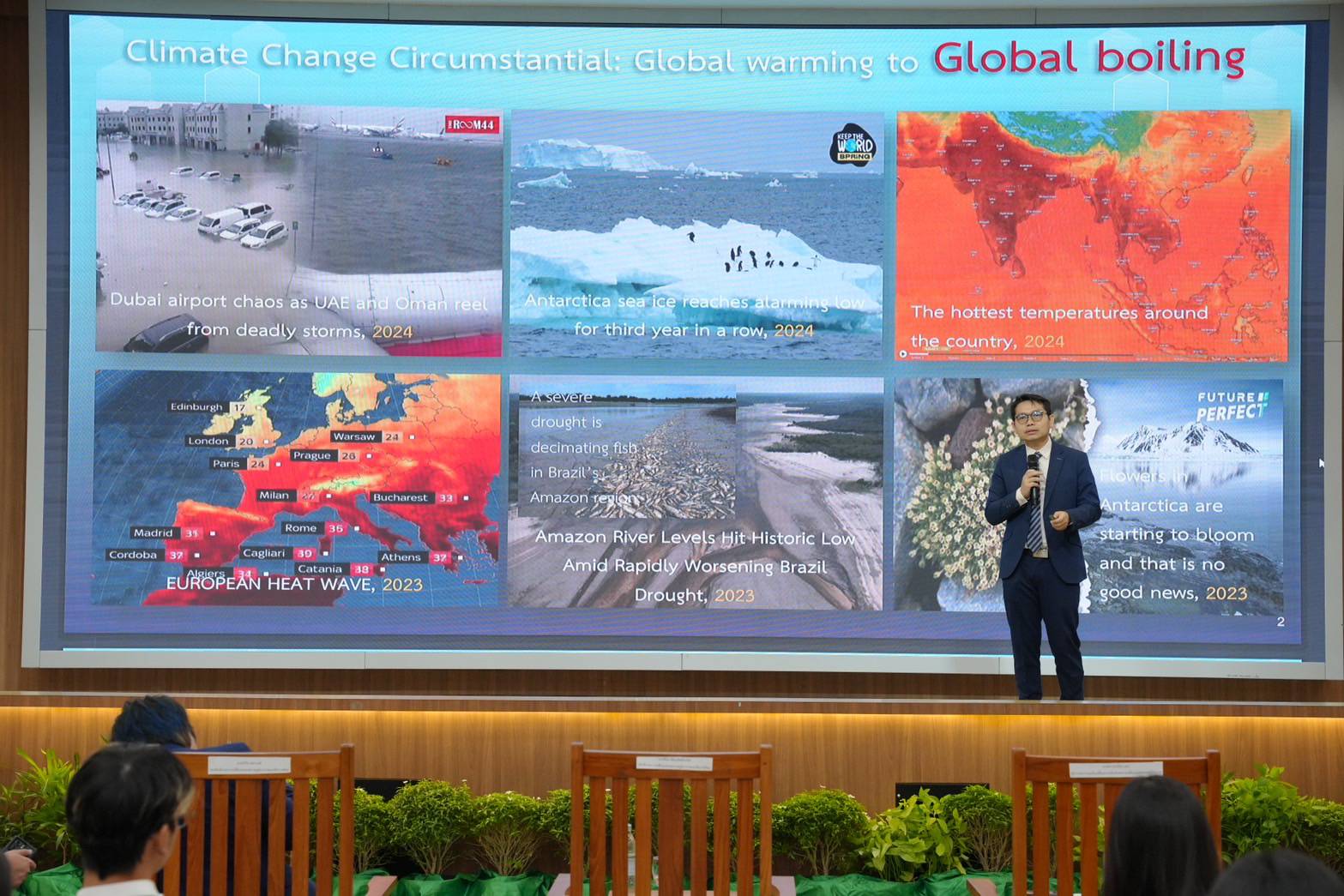 ดร.พิรุณ สัยยะสิทธิ์พานิช อธิบดีกรมการเปลี่ยนแปลงสภาพภูมิอากาศและสิ่งแวดล้อม กล่าวว่า สภาพอากาศรุนแรง (Extreme Weather Events) ยังคงเป็นหนึ่งในภัยคุกคามหลักของโลก โดยเป็นอันดับที่ 2 ของความเสี่ยงในปี 2025 และอันดับ 1 ของความเสี่ยงระยะยาวในปี 2035 สะท้อนให้เห็นว่า ผลกระทบจากการเปลี่ยนแปลงสภาพภูมิอากาศจะยังคงรุนแรงขึ้นเรื่อย ๆ ในทศวรรษหน้า ซึ่งเมื่อปี 2024 ที่ผ่านมาเป็นปีที่โลกเผชิญกับภัยพิบัติทางสภาพอากาศอย่างหนัก ทั้งการเกิดคลื่นความร้อนที่เกิดขึ้นในหลายประเทศในเอเชีย การเกิดไฟป่าครั้งใหญ่ในบางพื้นที่ รวมถึงน้ำท่วมครั้งใหญ่จากฝนที่ตกหนักต่อเนื่อง อีกทั้ง การเปลี่ยนแปลงที่สำคัญของระบบโลก (Critical Change to Earth Systems) ก็กำลังเร่งตัวขึ้นอย่างชัดเจน โดยเฉพาะอัตราการละลายของธารน้ำแข็งที่เพิ่มสูงขึ้นและระดับน้ำทะเลที่เพิ่มขึ้นอย่างต่อเนื่อง