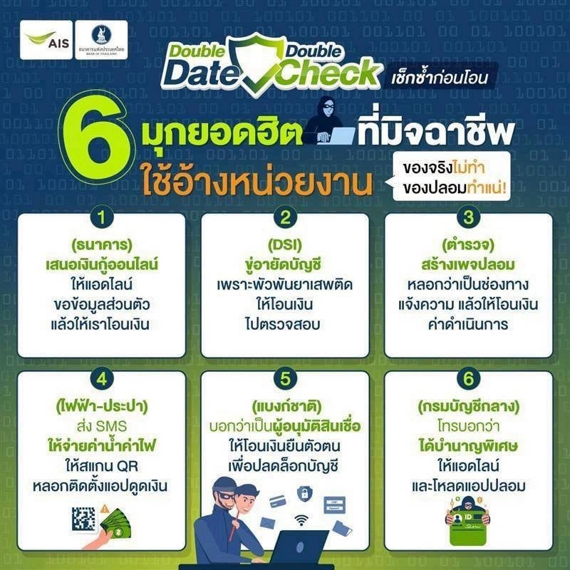 จำไว้เสมอว่า “ของจริงไม่ทำ ของปลอมเท่านั้นที่มาหลอก!” สงสัยให้ ” Double Check เช็กซ้ำก่อนโอน!” ถ้าไม่แน่ใจให้ตรวจสอบกับหน่วยงานโดยตรงเสมอ
