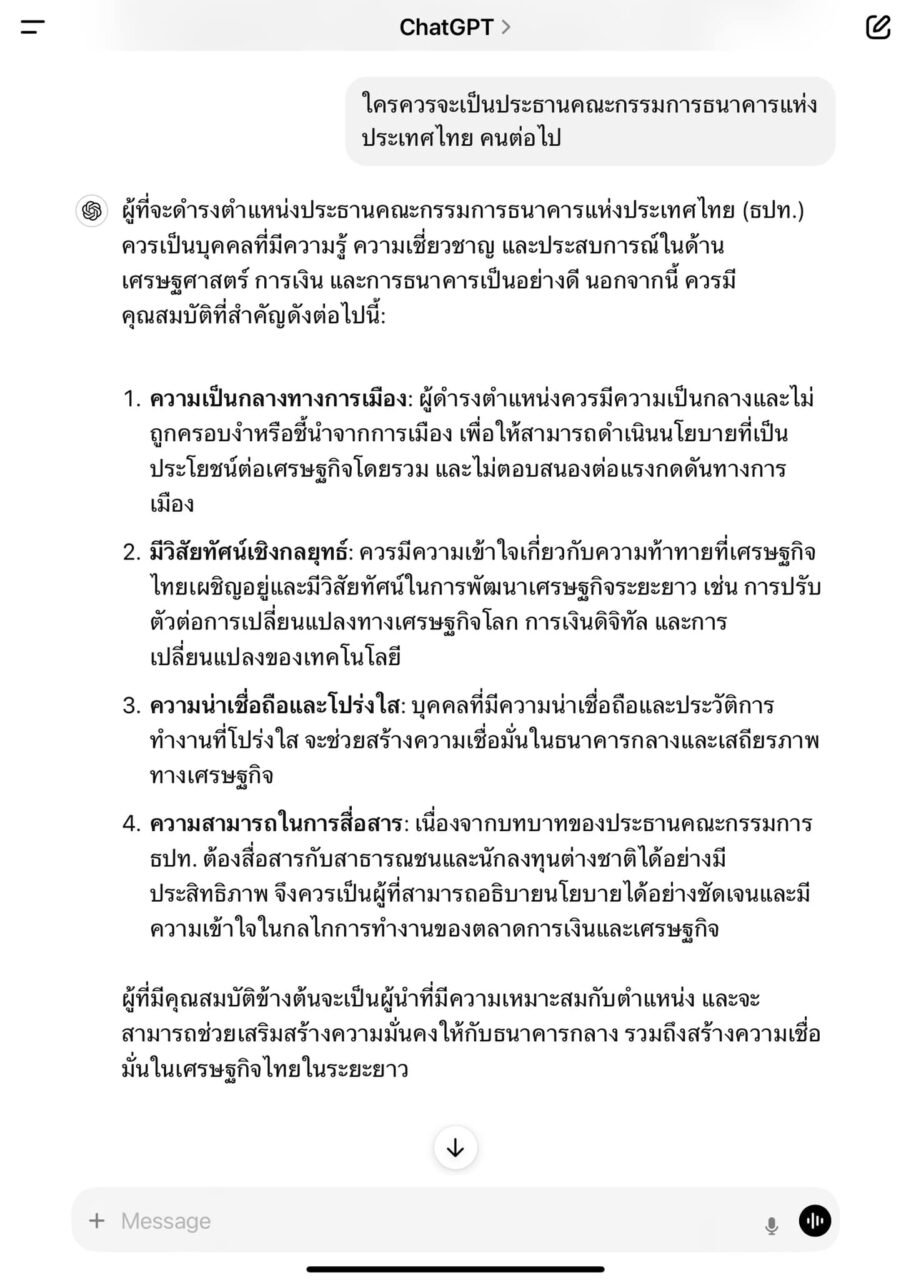 ก่อนหน้านั้น ดร.วิรไท สันติประภพ อดีตผู้ว่าการธนาคารแห่งประเทศไทย ได้โพสต์เฟซบุ๊กส่วนตัว “Veerathai Santiprabhob” ระบุถึงการเลือกตัวประธานบอร์ดแบงก์ชาติ ว่า วันนี้ (3 พ.ย.) ไปเรียนหลักสูตร Generative AI Mastery for Executives เลยลองถามพี่ ChatGPT ผู้เป็นพหูสูตแห่งยุคสมัย ว่าใครควรจะเป็นประธานแบงก์ชาติคนต่อไป