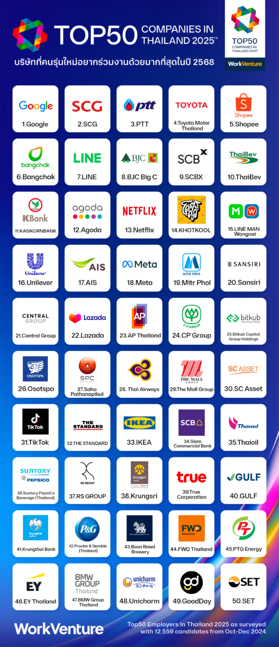 “Top 50 Companies in Thailand ที่จัดทำขึ้นจากการรวบรวมข้อมูลเชิงลึกผ่านการสำรวจความคิดเห็นออนไลน์ของกลุ่มคนทำงานรุ่นใหม่ โดยให้มีการระบุองค์กรที่มีความโดดเด่นด้านแบรนด์นายจ้าง และได้รับการจดจำในฐานะองค์กรอันดับต้น (Top-of-Mind) รวมทั้งปัจจัยที่ช่วยดึงดูดและสร้างความพึงพอใจให้กับคนรุ่นใหม่ ซึ่งการสำรวจครั้งนี้ ครอบคลุมกลุ่มตัวอย่างกว่า 12,559 คน อายุ 22-35 ปี จบการศึกษาระดับปริญญาตรีขึ้นไป อาศัยอยู่ในกรุงเทพฯ และปริมณฑล โดยไม่จำกัดเพศของผู้ตอบแบบสำรวจ สำรวจเป็นเวลา 3 เดือน ตั้งแต่เดือนตุลาคม-ธันวาคม ปี 2567”