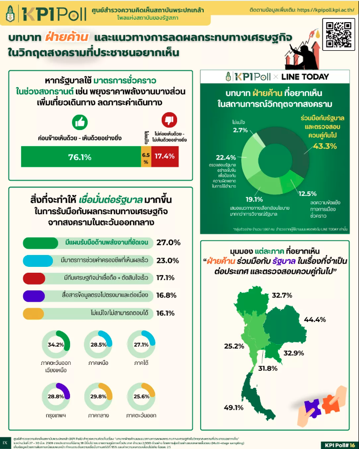 KPI Poll เผยผลสำรวจ พบประชาชนร้อยละ 43.3 อยากเห็นฝ่ายค้านร่วมมือรัฐบาลกู้วิกฤตประเทศ มากกว่าจ้องจับผิด ขณะที่ร้อยละ 76.1 หนุนมาตรการช่วยค่าครองชีพช่วงสงกรานต์ พร้อมจี้รัฐเร่งคลอดแผนรับมือราคาพลังงาน จากสงครามตะวันออกกลาง เพื่อสร้างความเชื่อมั่นวันนี้ (10 เม.ย.2569) ศูนย์สำรวจความคิดเห็นสถาบันพระปกเกล้า (KPI Poll) สำรวจความคิดเห็นเรื่อง "บทบาทฝ่ายค้าน และแนวทางการลดผลกระทบทางเศรษฐกิจในวิกฤตสงครามที่ประชาชนอยากเห็น" ระหว่างวันที่ 27-30 มี.ค.2569 จากประชาชนที่มีอายุ 18 ปีขึ้นไป กระจายตามภูมิภาคทั่วประเทศ จำนวน 2,000 ตัวอย่าง พบว่า ประชาชนส่วนใหญ่ ร้อยละ 43.3 อยากให้ฝ่ายค้านร่วมมือกับรัฐบาลในเรื่องที่จำเป็นต่อประเทศ และตรวจสอบควบคู่กันไป รองลงมาร้อยละ 22.4 ต้องการให้ทำหน้าที่ตรวจสอบรัฐบาลอย่างเข้มข้น เพื่อป้องกันความผิดพลาดในการใช้อำนาจ