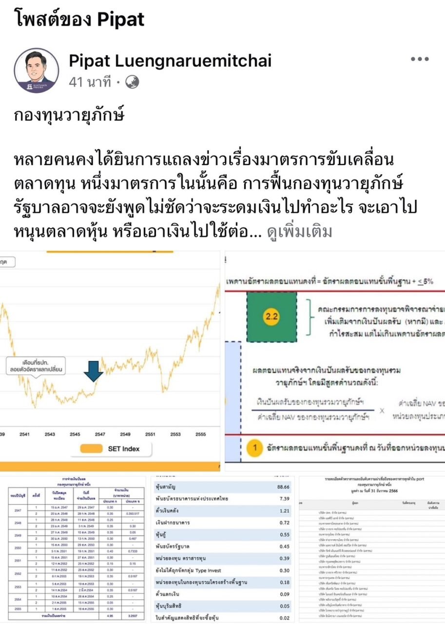 “ดร.พิพัฒน์ เหลืองนฤมิตชัย” หัวหน้านักเศรษฐศาสตร์ กลุ่มธุรกิจการเงินเกียรตินาคินภัทร ได้โพสต์เฟซบุ๊ก Pipat Luengnaruemitchai เล่าถึง “กองทุนวายุภักษ์” ที่นายพิชัย ชุณหวชิร รองนายกรัฐมนตรี และรมว.คลัง ได้แถลงร่วมกับ สำนักงาน ก.ล.ต.และตลาดหลักทรัพย์ฯ เมื่อวันที่ 24 มิ.ย.ที่ผ่านมา ว่าจะฟื้นกองทุนวายุภักษ์นี้ขึ้นมาใหม่