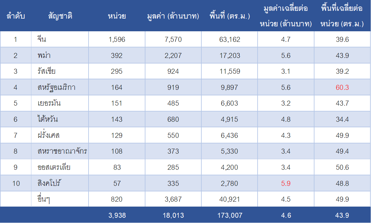 ทั้งนี้ สัญชาติพม่ามีมูลค่าการโอนกรรมสิทธิ์เพิ่มขึ้นมาก จำนวน 2,207 ล้านบาท (ลำดับที่ 2) เพิ่มขึ้นร้อยละ 344.1 จากช่วงเวลาเดียวกันของปีก่อนที่มีมูลค่า 497 ล้านบาท