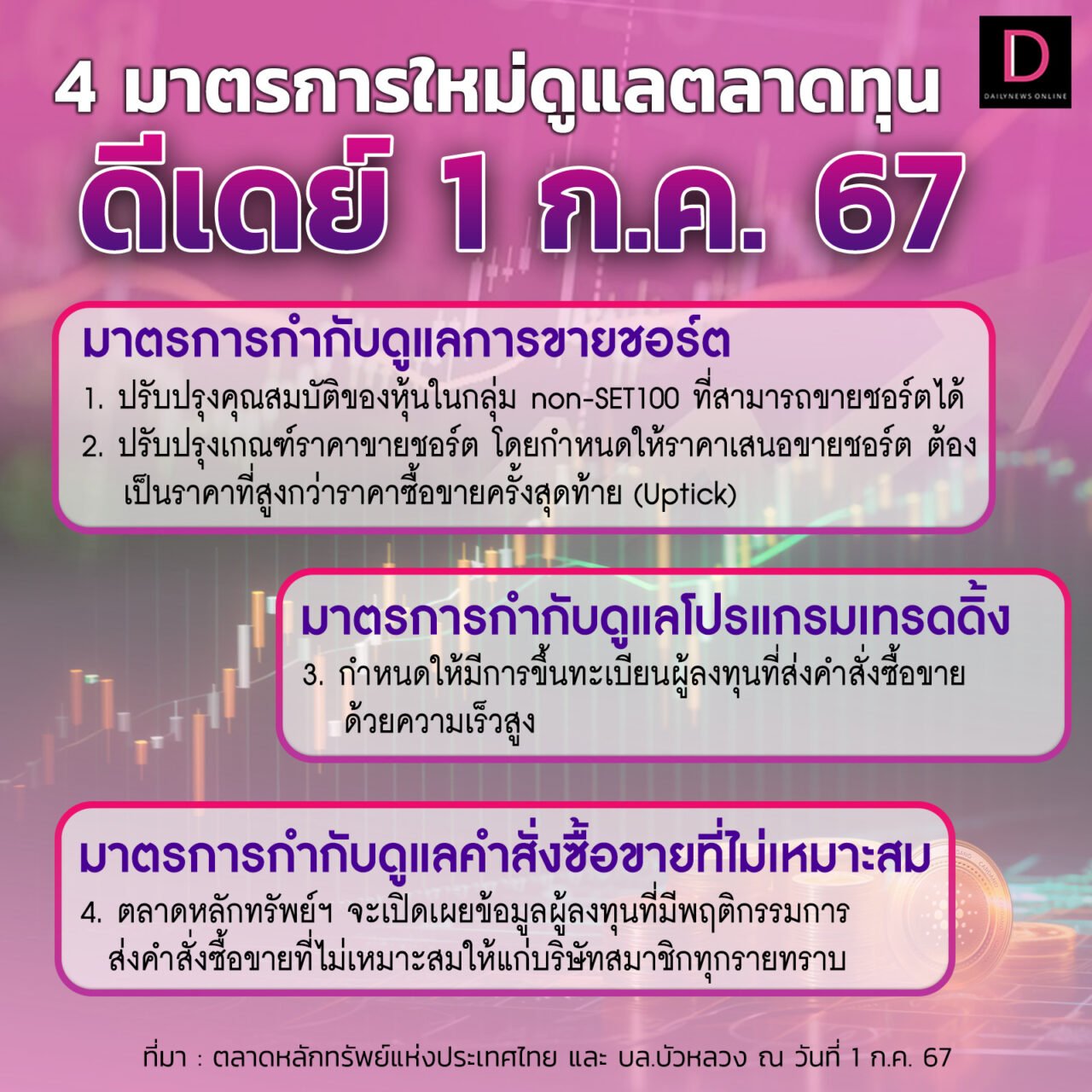 เปิด 4 มาตรการใหม่ ยกระดับ-กำกับซื้อขายหุ้น เริ่ม 1 ก.ค.67 นี้ ช่วยฟื้นตลาดทุนไทย