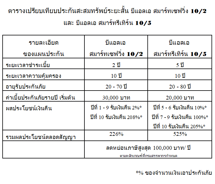 จากรายละเอียดด้านบน ประกันสะสมทรัพย์ทั้ง 2 แบบ ประกัน 10/2 และประกัน 10/5 จะมีระยะเวลาการมอบผลประโยชน์เงินคืนที่ต่างกัน หากคุณต้องการผลประโยชน์เงินคืนที่สม่ำเสมอในทุกๆ ปี แนะนำแบบประกันบีแอลเอ สมาร์ทเซฟวิ่ง 10/2 หรือหากต้องการรับเงินคืนก้อนใหญ่ เพื่อนำไปใช้จ่ายหรือต่อยอดในการลงทุน อาจลองพิจารณาประกันบีแอลเอ สมาร์ทรีเทิร์น 10/5เงินคืนก้อนใหญ่จากประกันสะสมทรัพย์ นำไปใช้อะไรได้บ้าง?